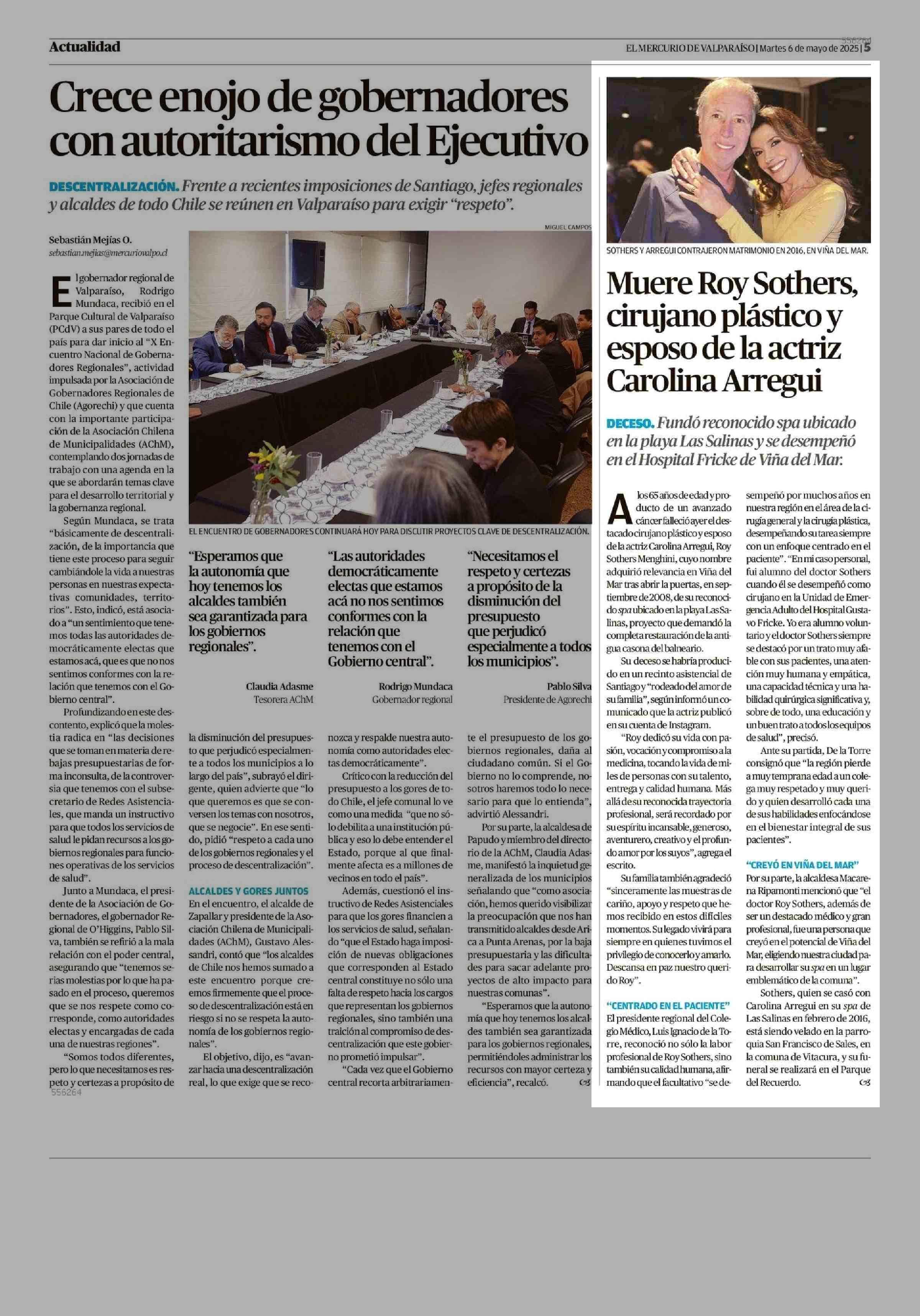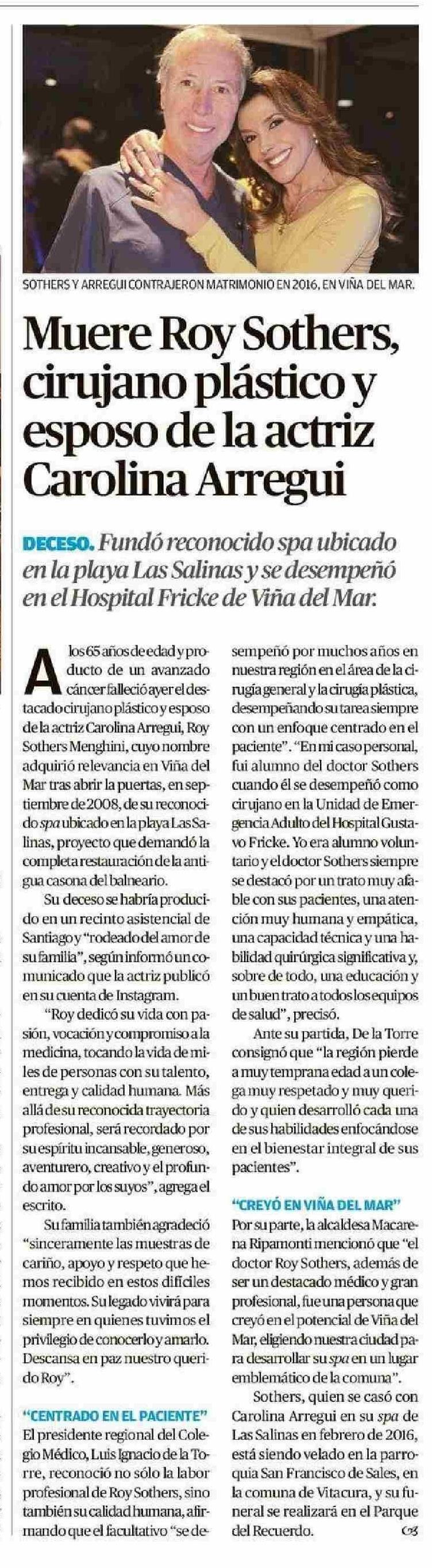 Muere Roy Sothers, cirujano plástico y esposo de la actriz Carolina Arregui 06-05-2025 El Mercurio de Valparaíso |