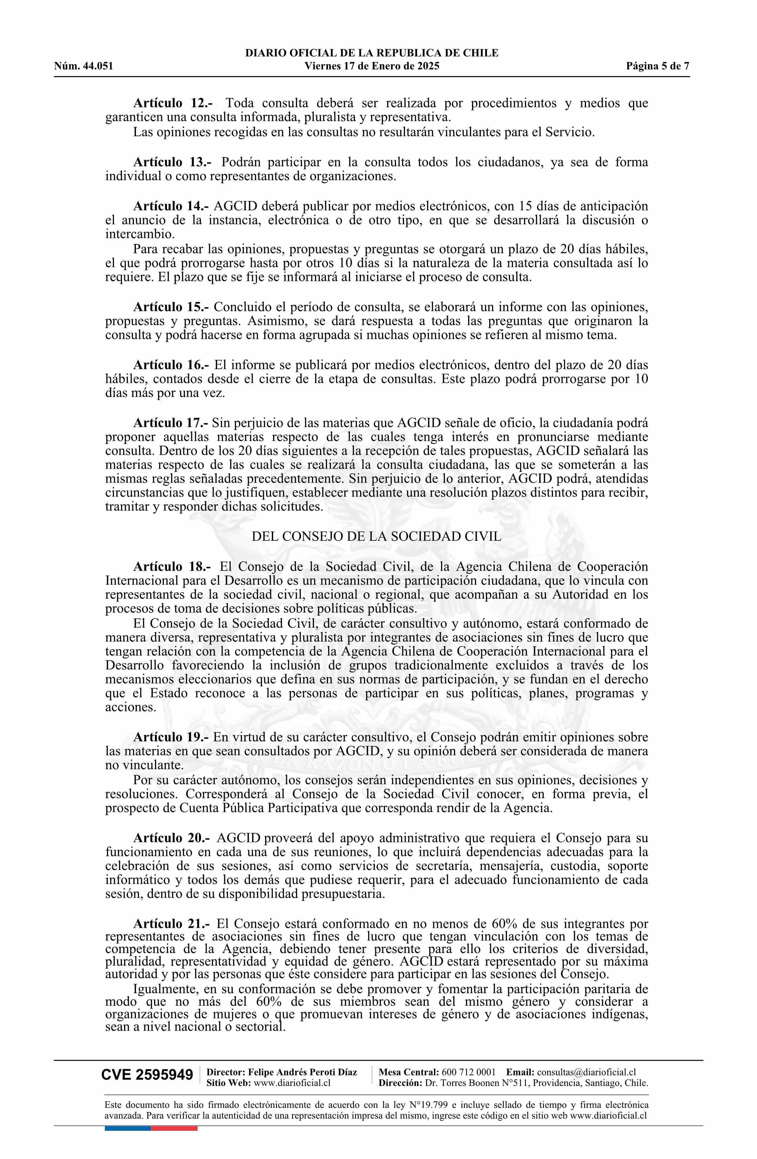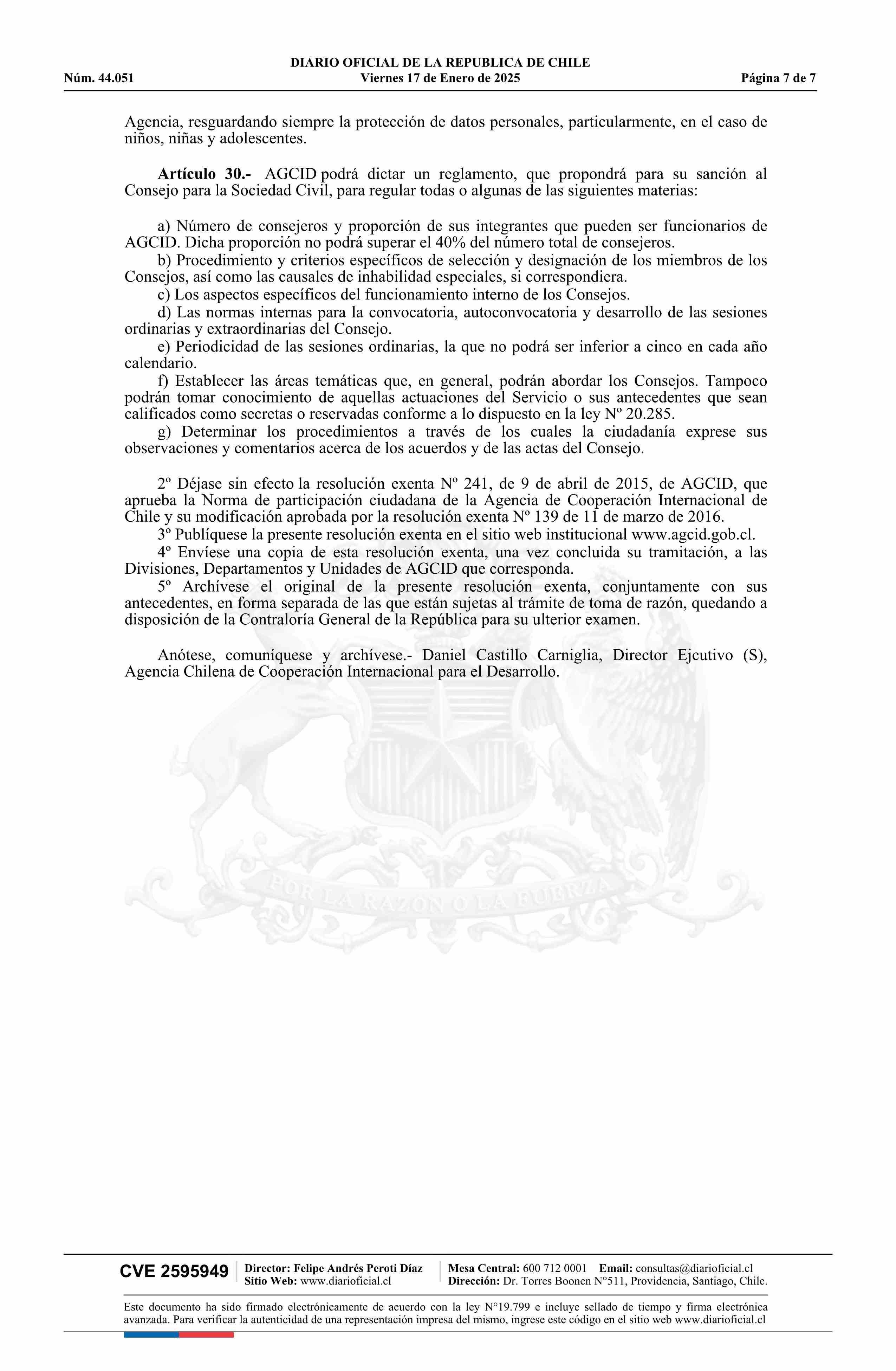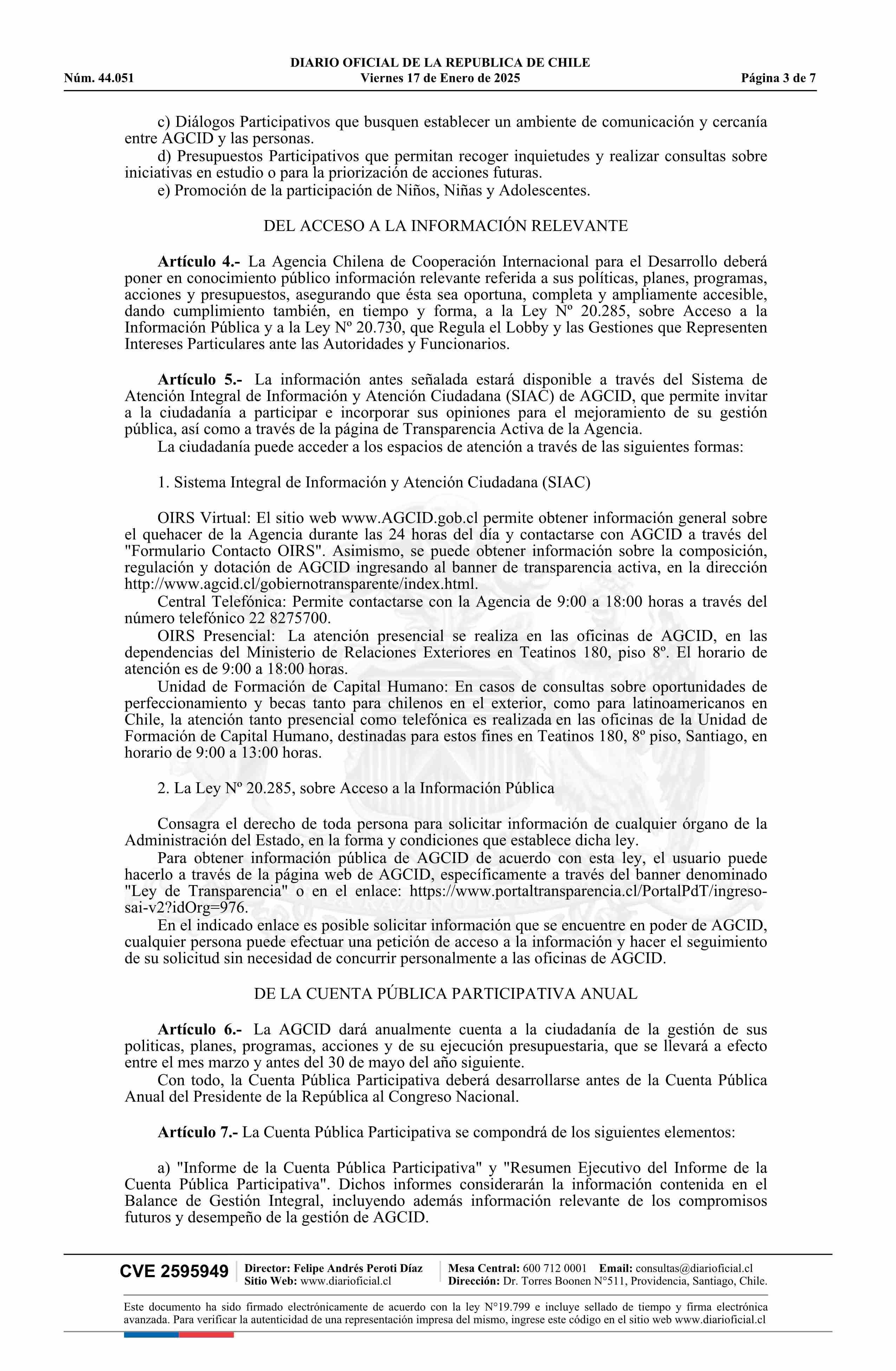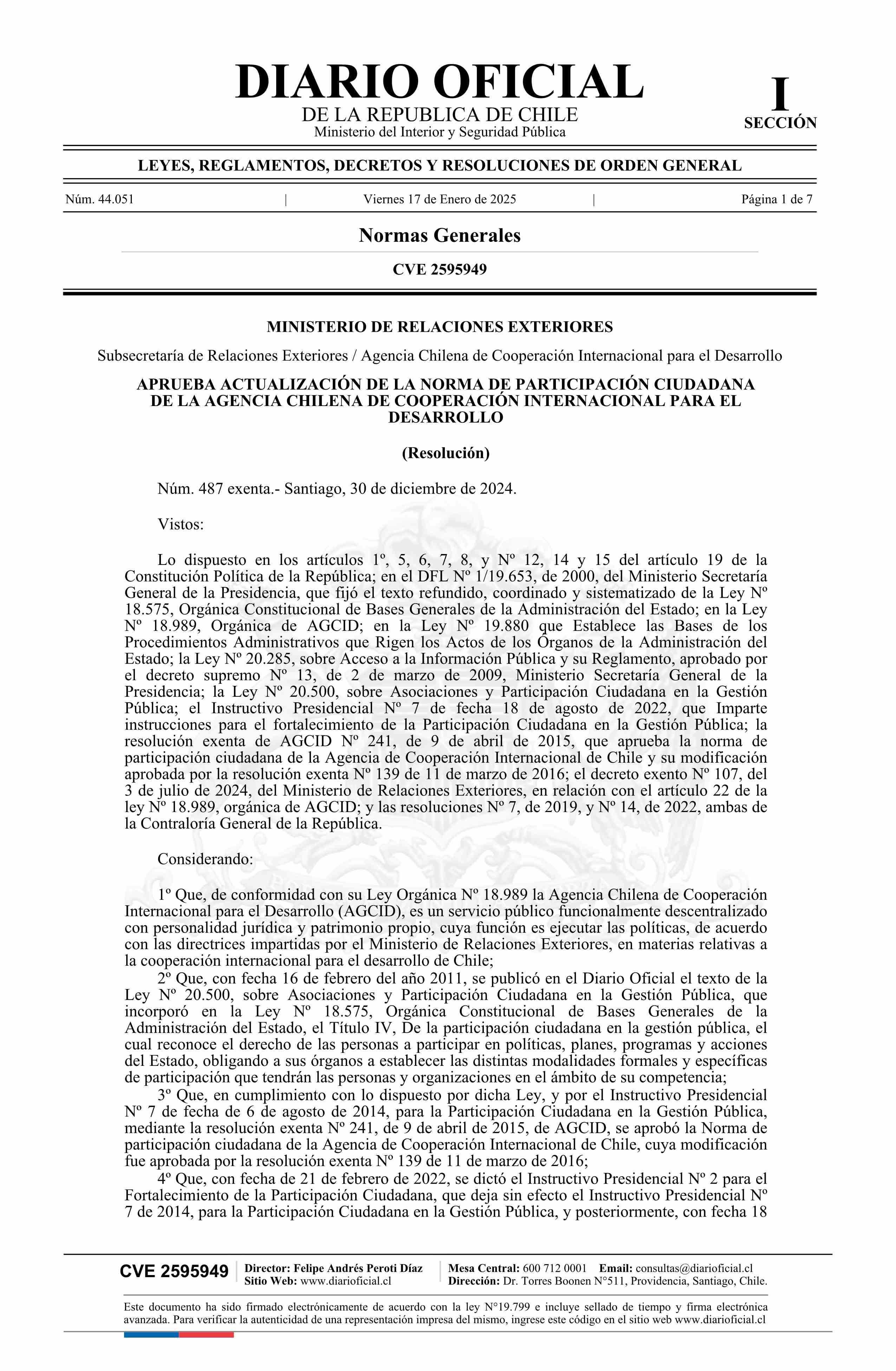 Resolución exenta número 487, de 2024.- Aprueba actualización de la norma de participación ciudadana de la Agencia Chilena de Cooperación Internacional para el Desarrollo 17-01-2025 Diario Oficial Edición Electrónica |