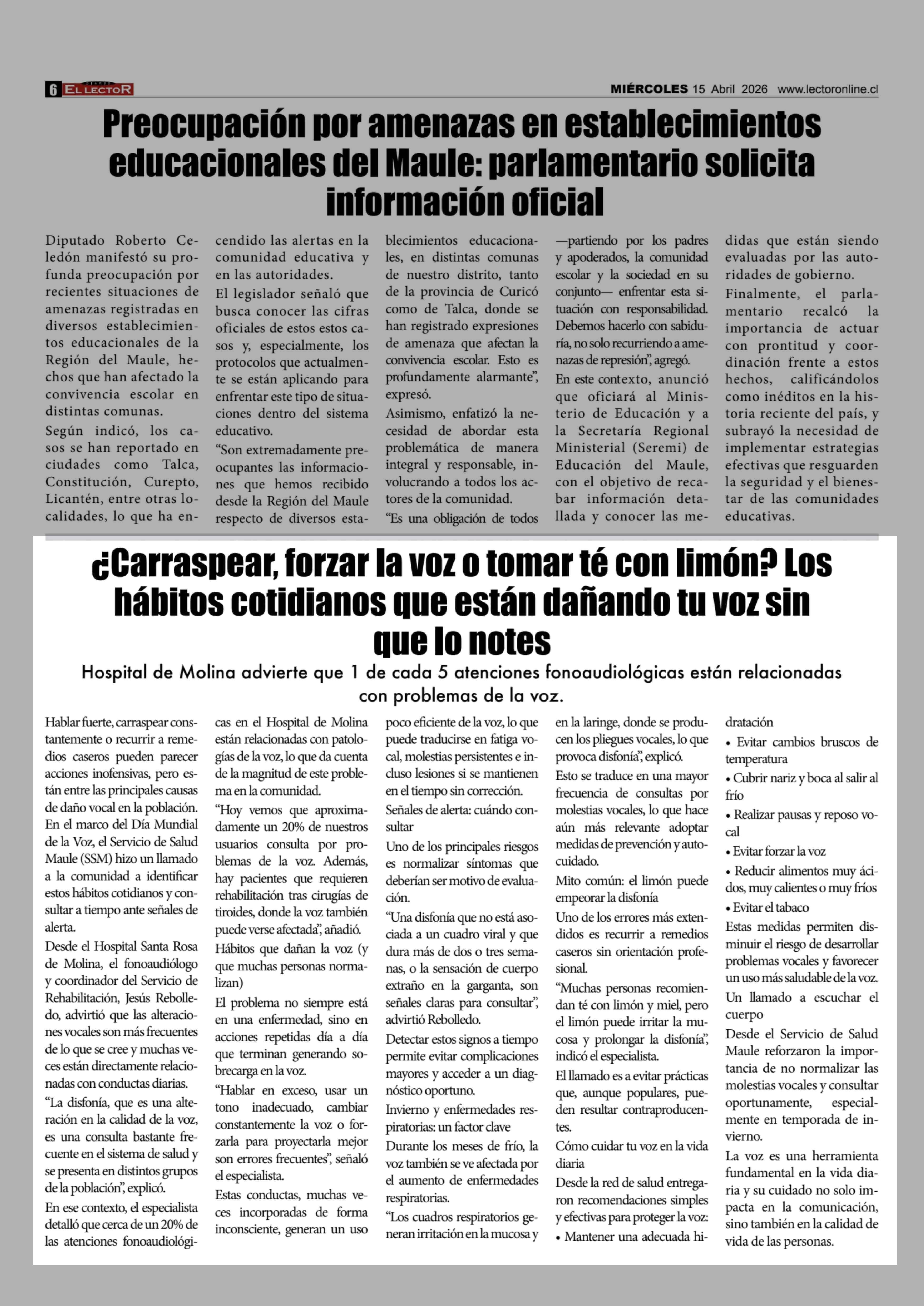 ¿Carraspear, forzar la voz o tomar té con limón? Los hábitos cotidianos que están dañando tu voz sin que lo notes 15-04-2026 El Lector |