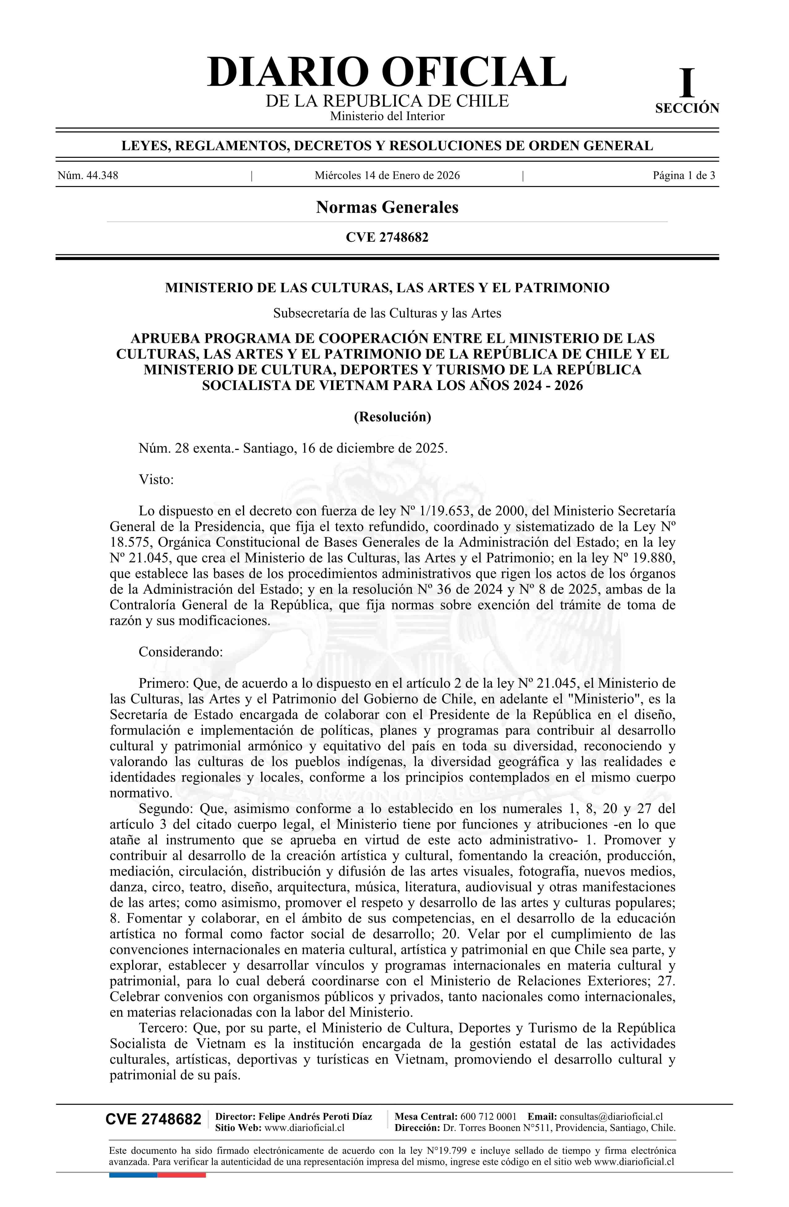 Resolución exenta número 28, de 2025.- Aprueba Programa de Cooperación Cultural entre el Ministerio de las Culturas, las Artes y el Patrimonio de la República de Chile y el Ministerio de Cultura, Deportes y Turismo de la República Socialista de Vietnam para los Años 2024-2026