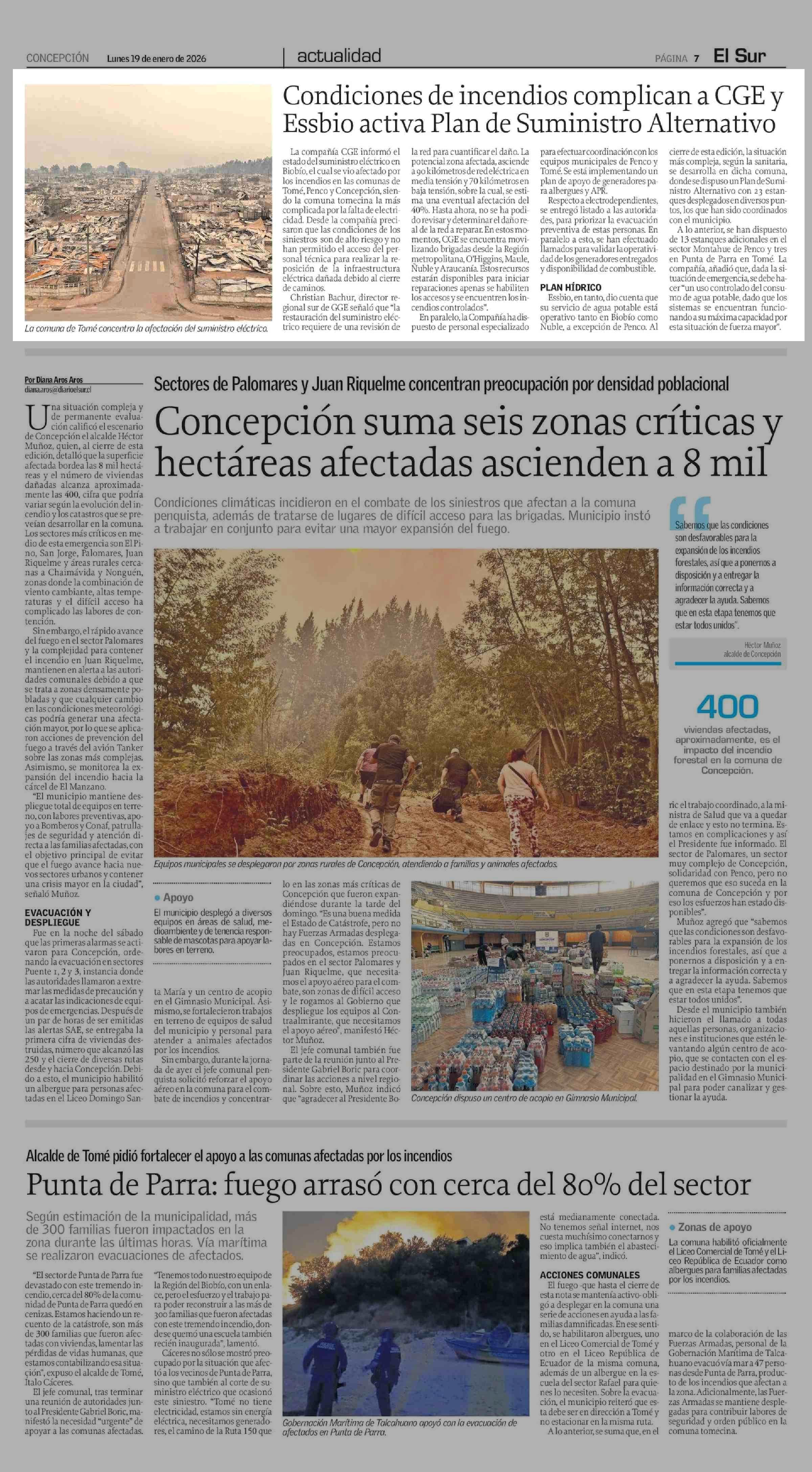 Condiciones de incendios complican a CGE y Essbio activa Plan de Suministro Alternativo 19-01-2026 El Sur |