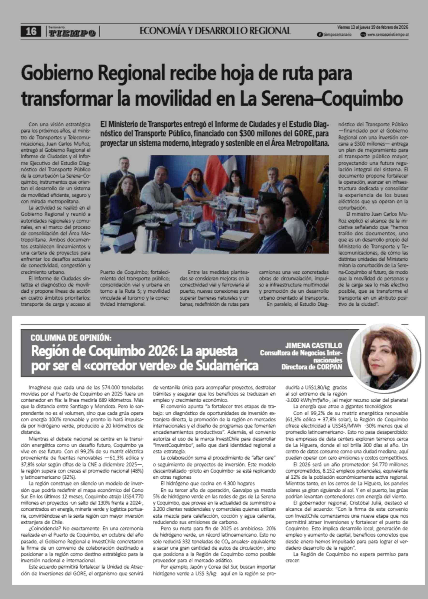 Columnas de Opinión: Región de Coquimbo 2026: La apuesta por ser el «corredor verde» de Sudamérica 13-02-2026 Semanario Tiempo |