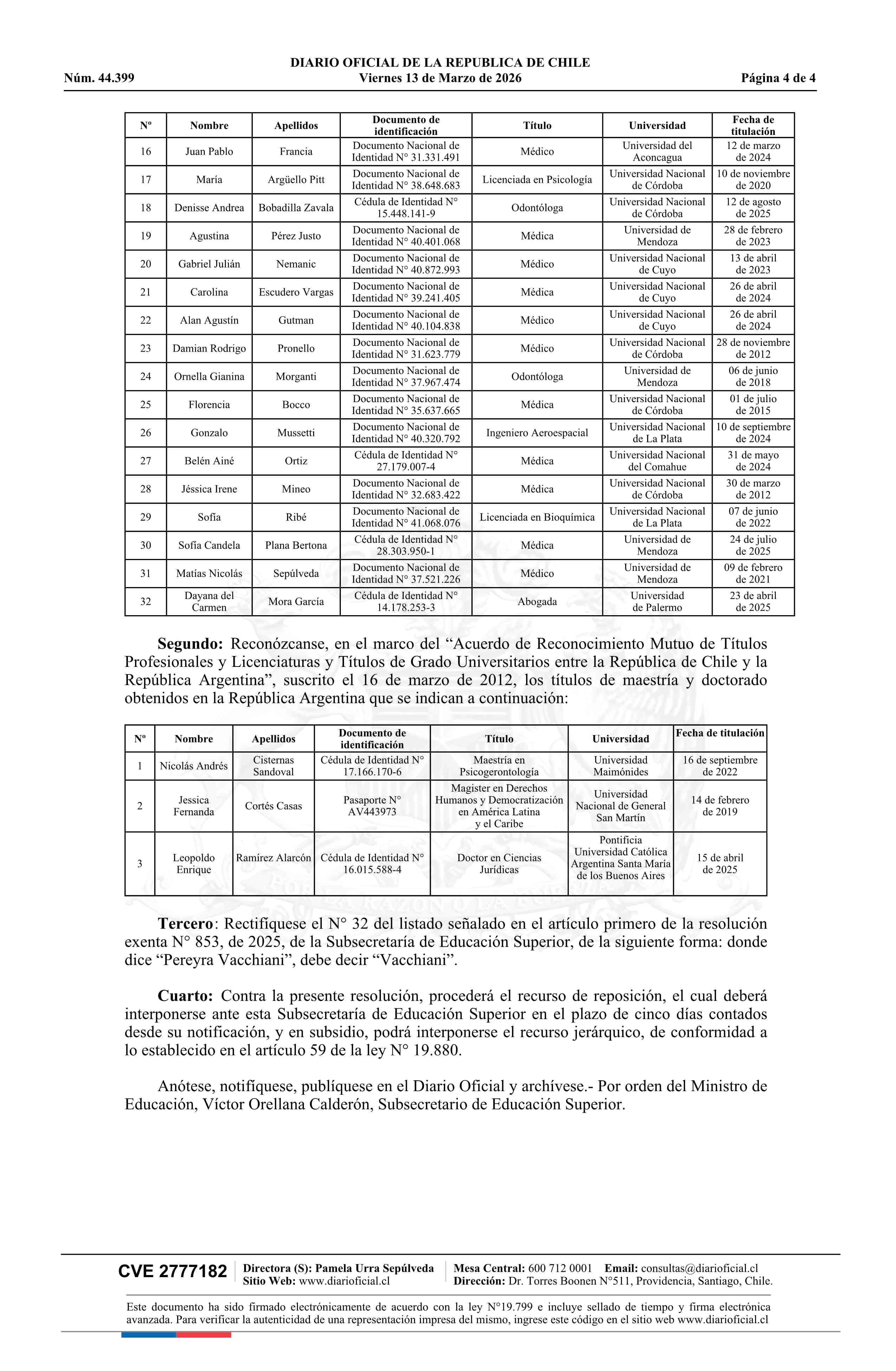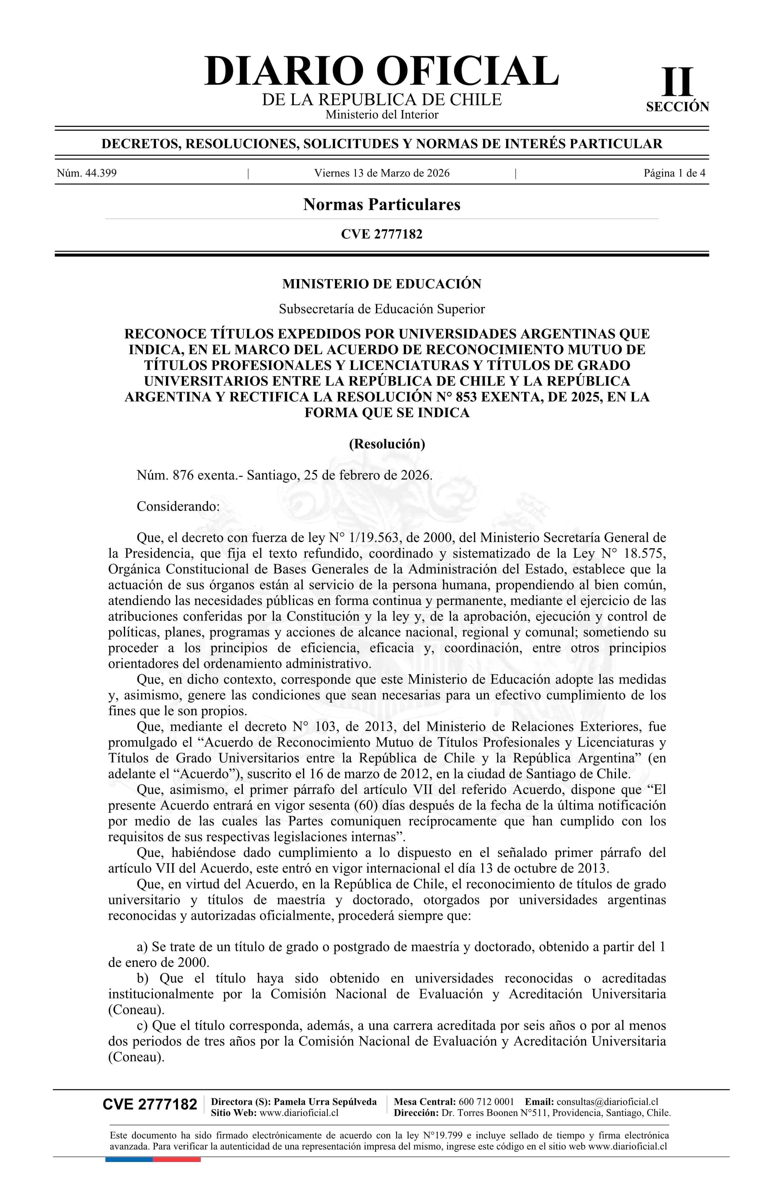| Título: | Resolución exenta número 876, de 2026.- Reconoce títulos expedidos por universidades argentinas que indica, en el marco del Acuerdo de Reconocimiento Mutuo de Títulos Profesionales y Licenciaturas y Títulos de Grado Universitarios entre la República de Chile y la República Argentina y rectifica la r |
