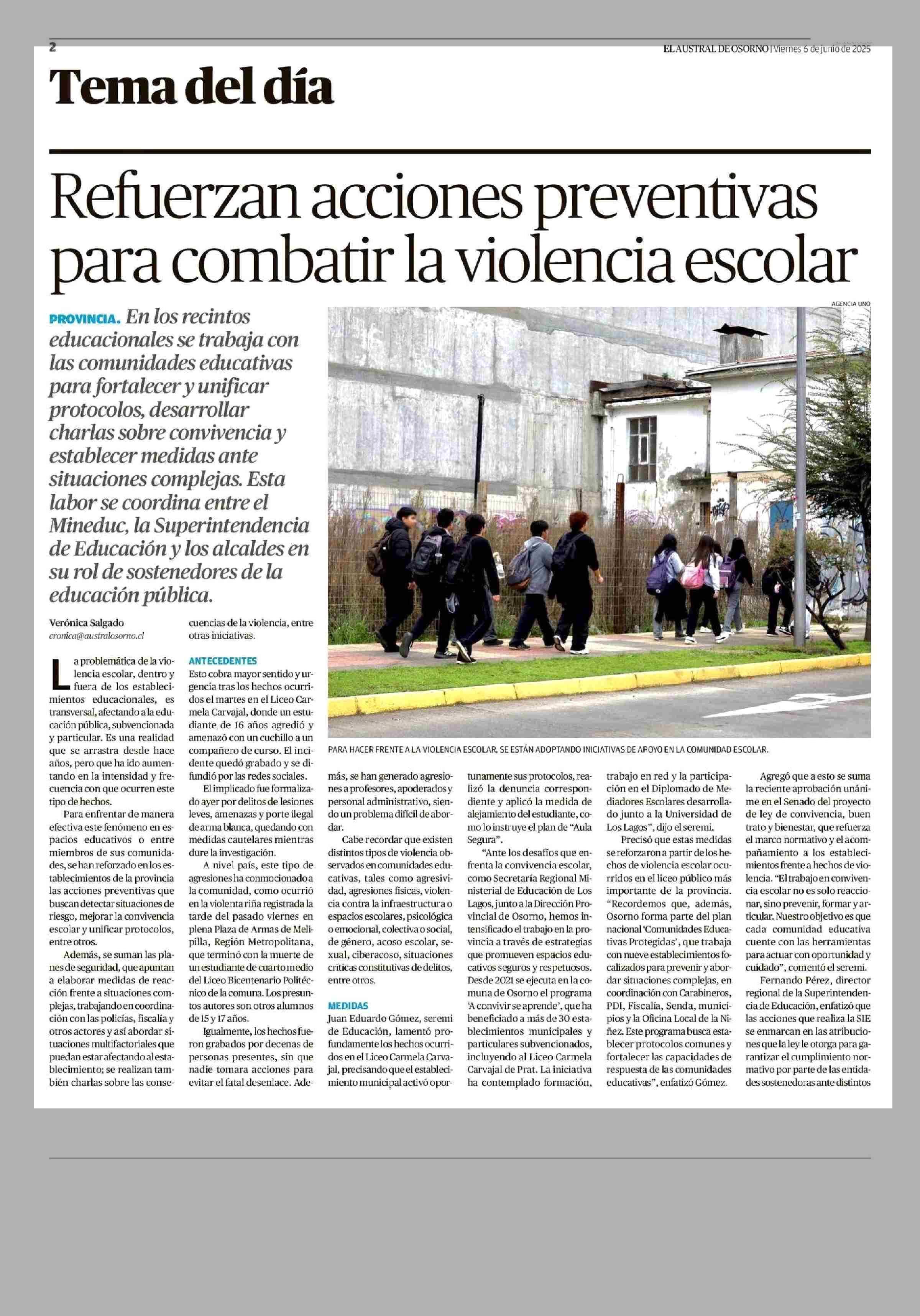 Refuerzan acciones preventivas para combatir la violencia escolar 06-06-2025 El Austral de Osorno |
