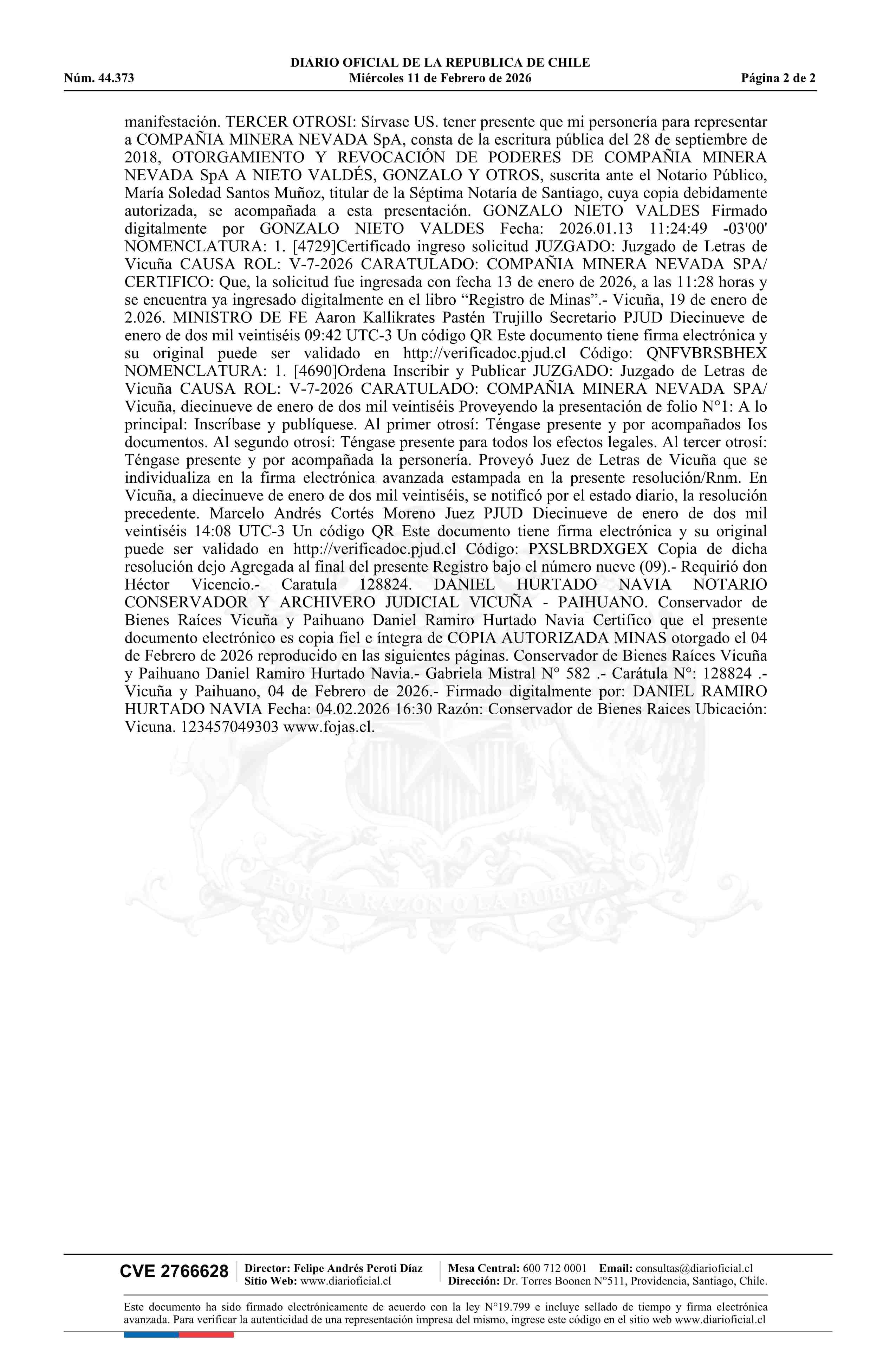 SNOOPY 1, 1 AL 10 / Compañía Minera Nevada SpA 11-02-2026 DIARIO OFICIAL CHILE - BOLETÍN OFICIAL DE MINERÍA |