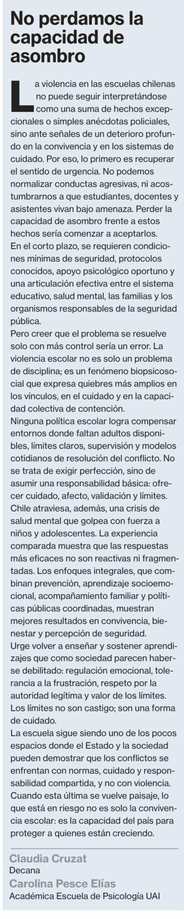Columnas de Opinión: No perdamos la capacidad de asombro 09-04-2026 La Segunda |