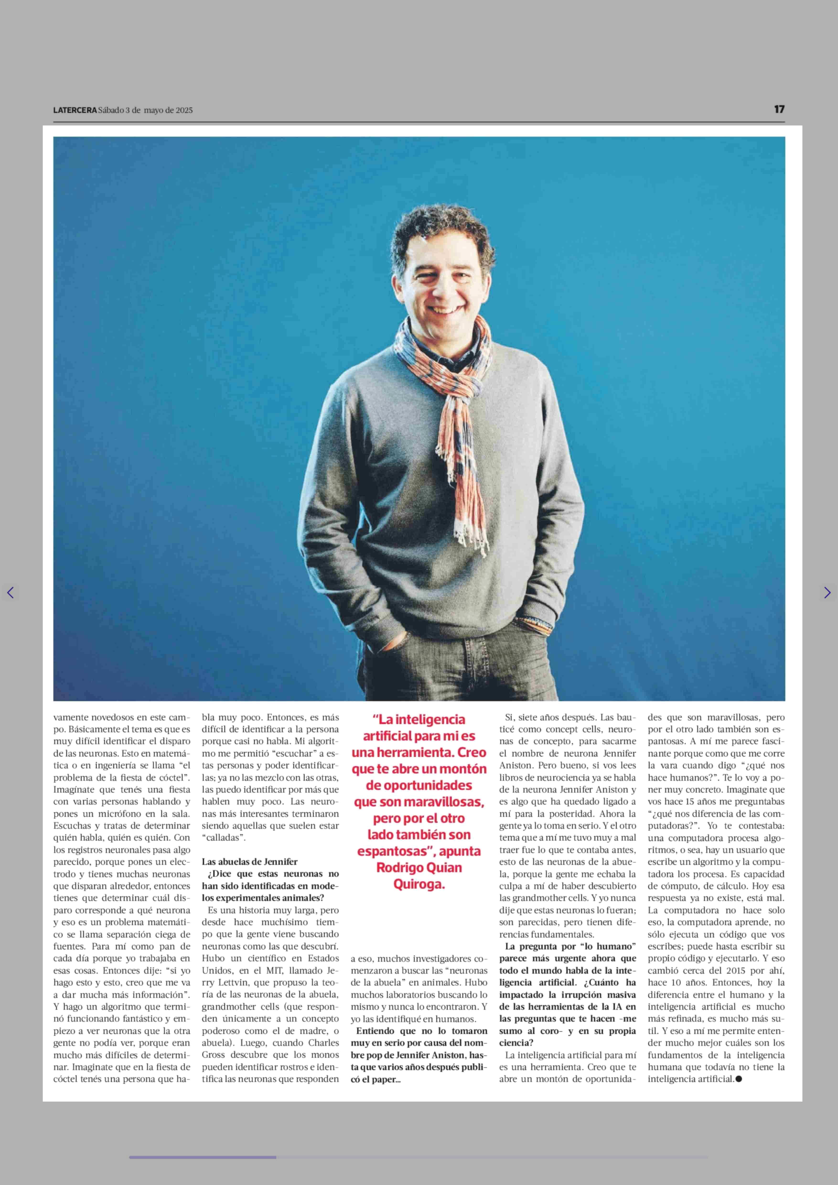 | Título: | Rodrigo Quiían Quiroga “Hoy la diferencia entre el humano y la IA es mucho más sutil” |