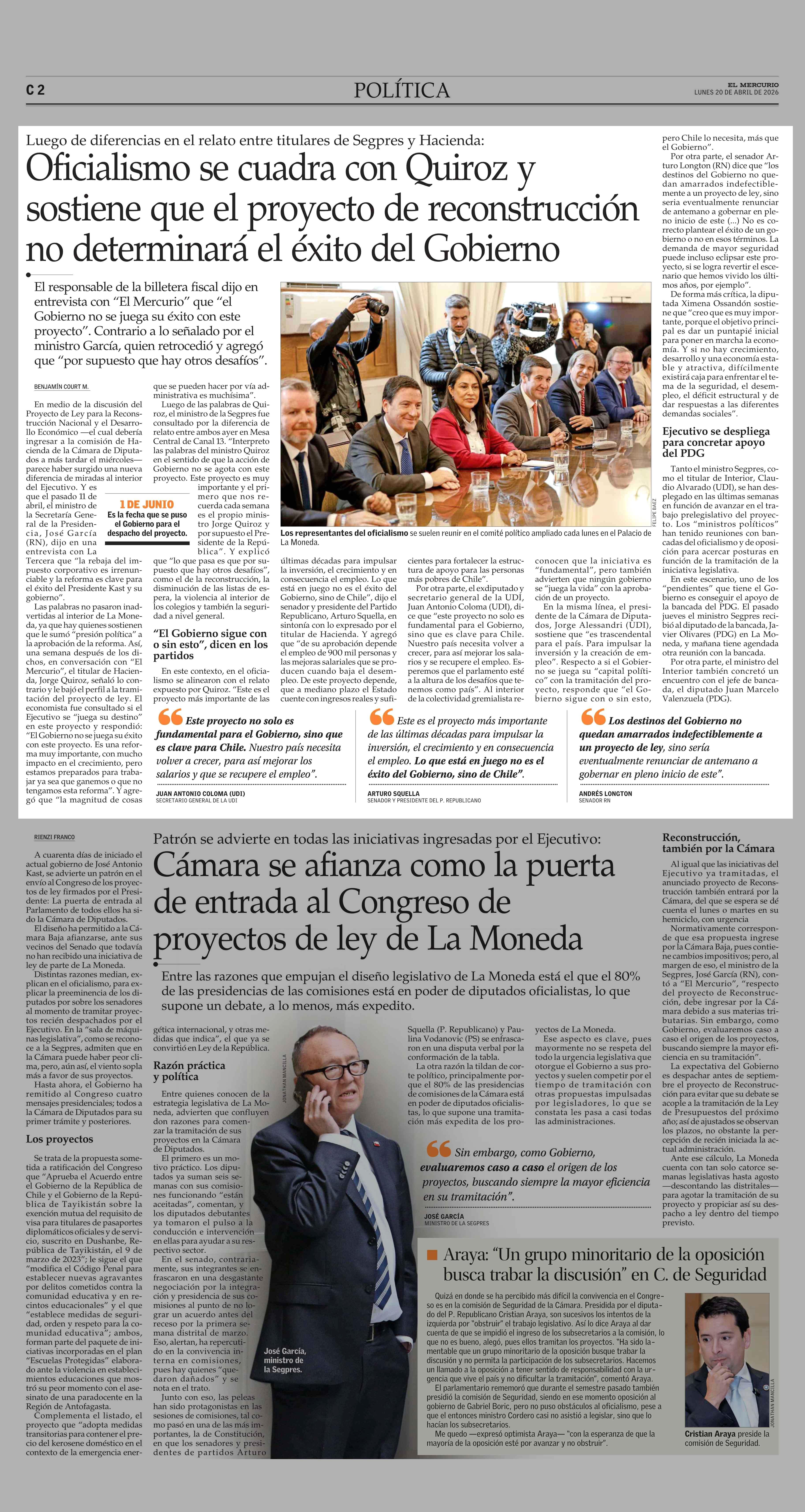 Oficialismo se cuadra con Quiroz y sostiene que el proyecto de reconstrucción no determinará el éxito del Gobierno 20-04-2026 El Mercurio |