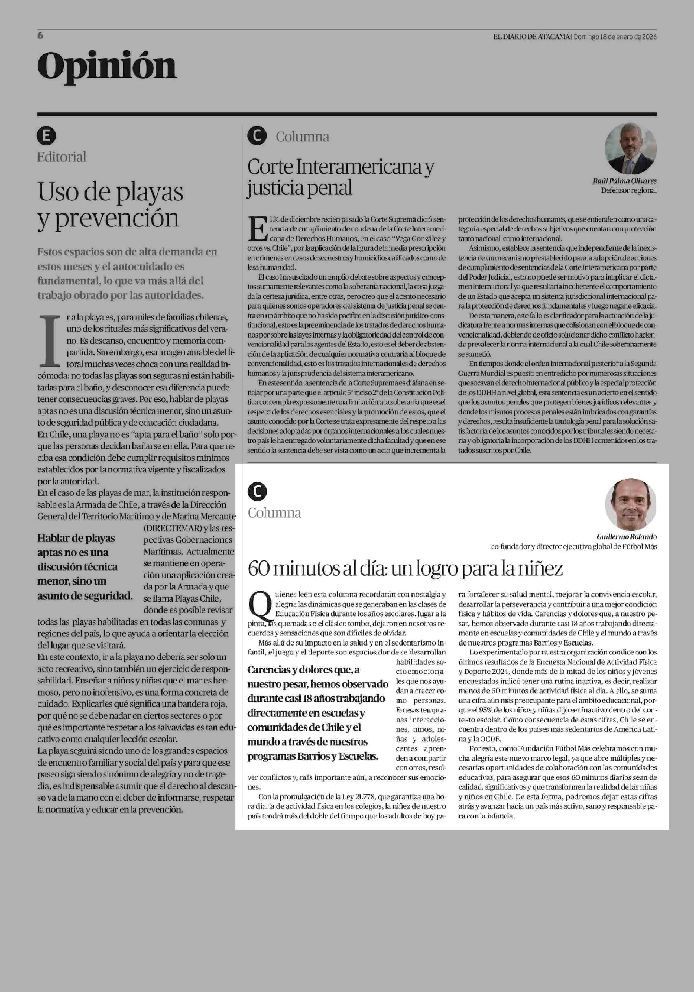 Columnas de Opinión: 60 Minutos al día: un logro para la niñez 18-01-2026 El Diario de Atacama |