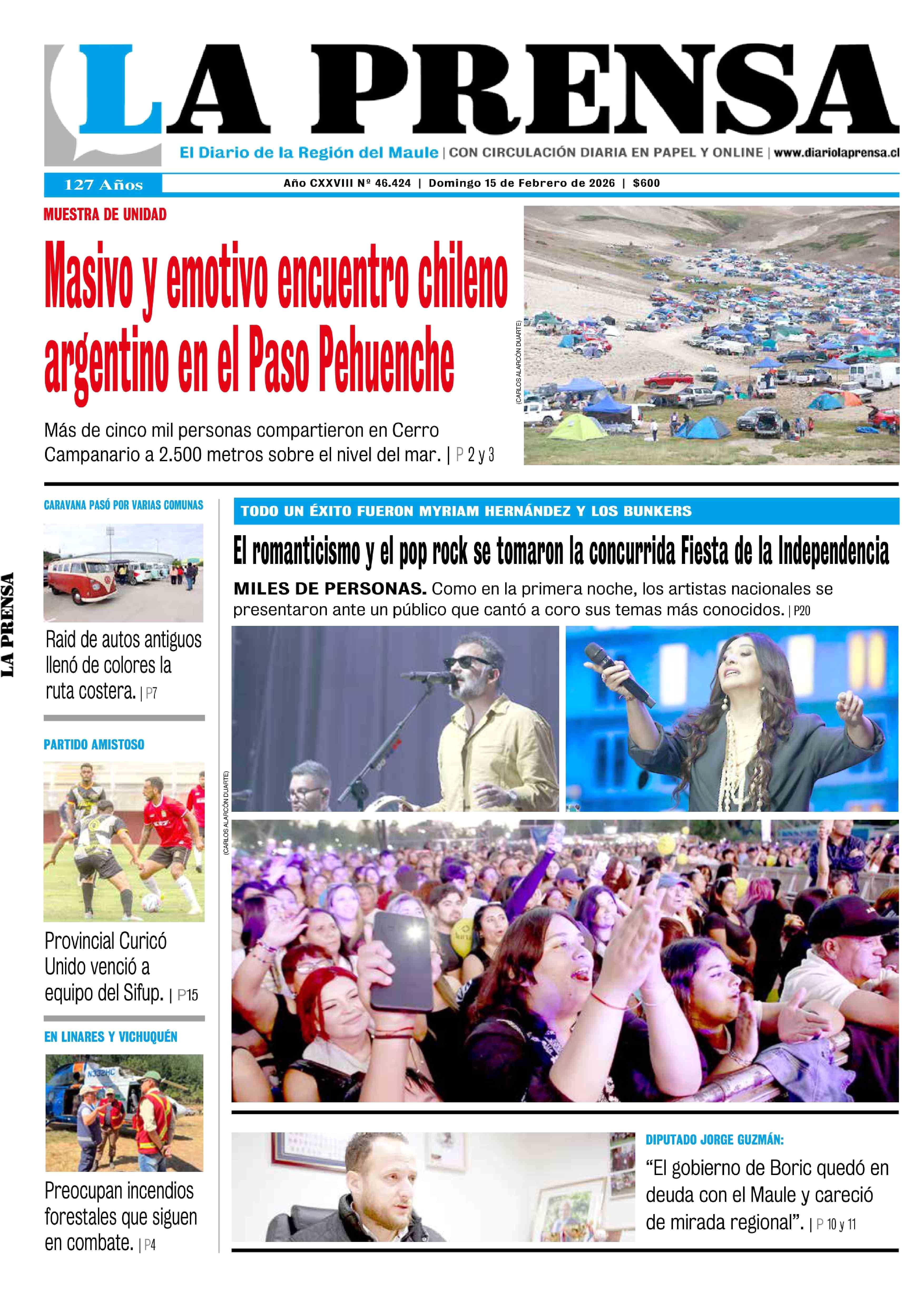 PORTADA LA PRENSA DE CURICÓ CHILE 15-02-2026 La Prensa de Curicó |