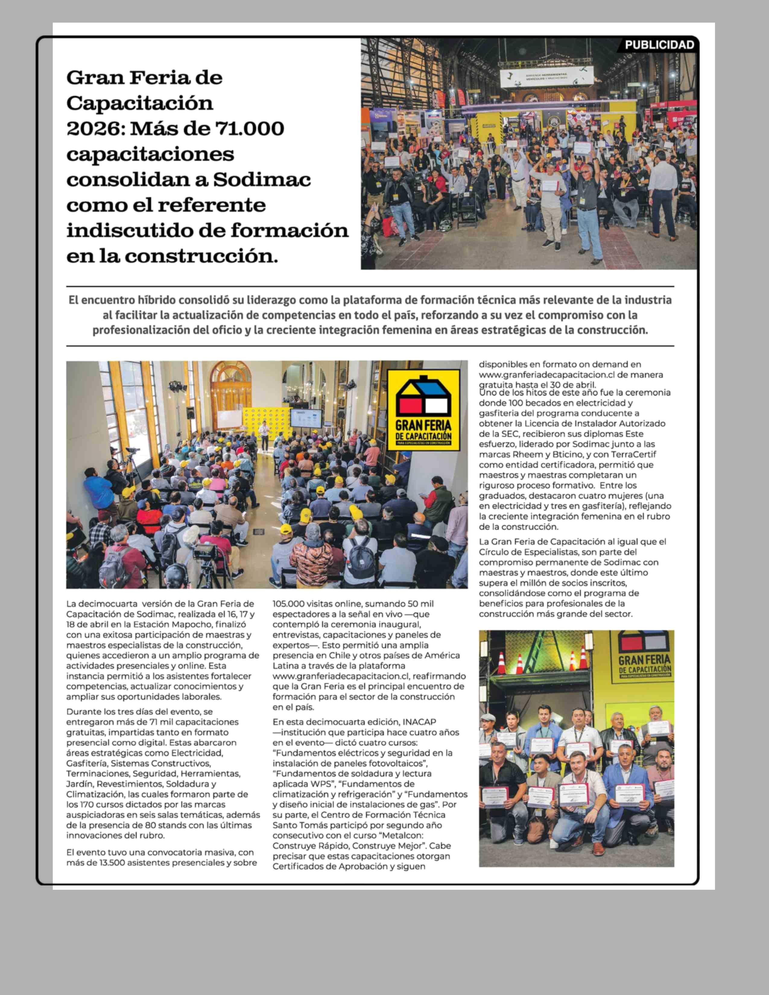 Título: Gran Feria de Capacitación 2026: Más de 71.000 capacitaciones consolidan a Sodimac como el referente indiscutido de formación en la construcción.