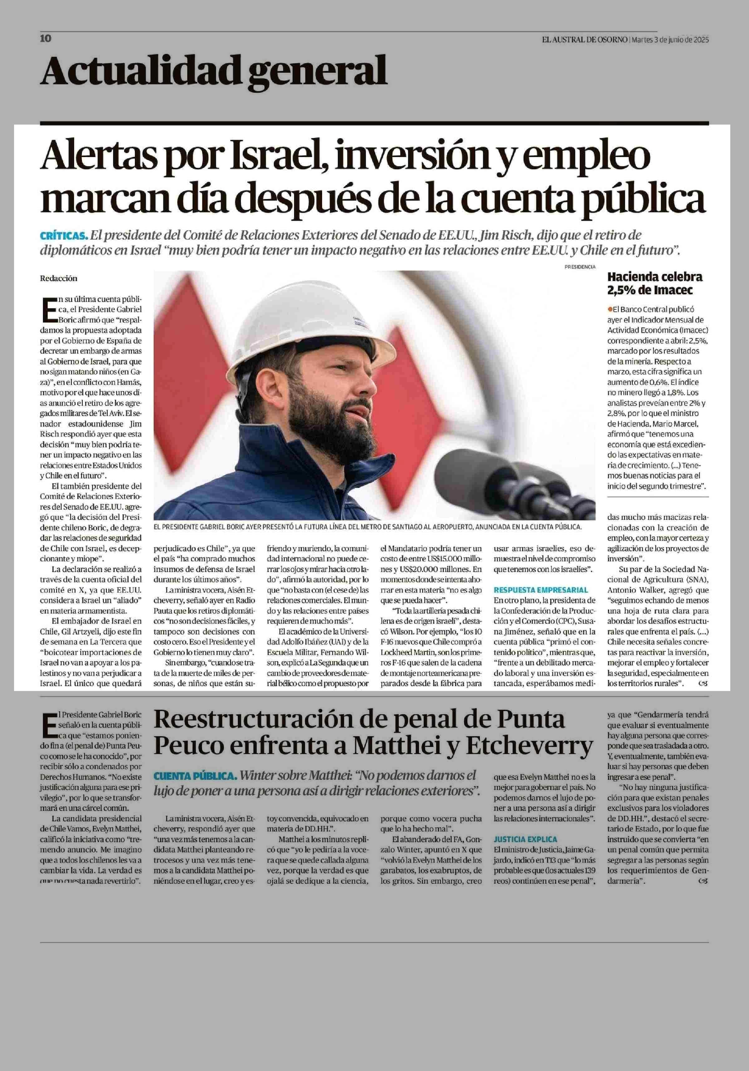 Alertas por Israel, inversión y empleo marcan día después de la cuenta pública 03-06-2025 El Austral de Osorno |