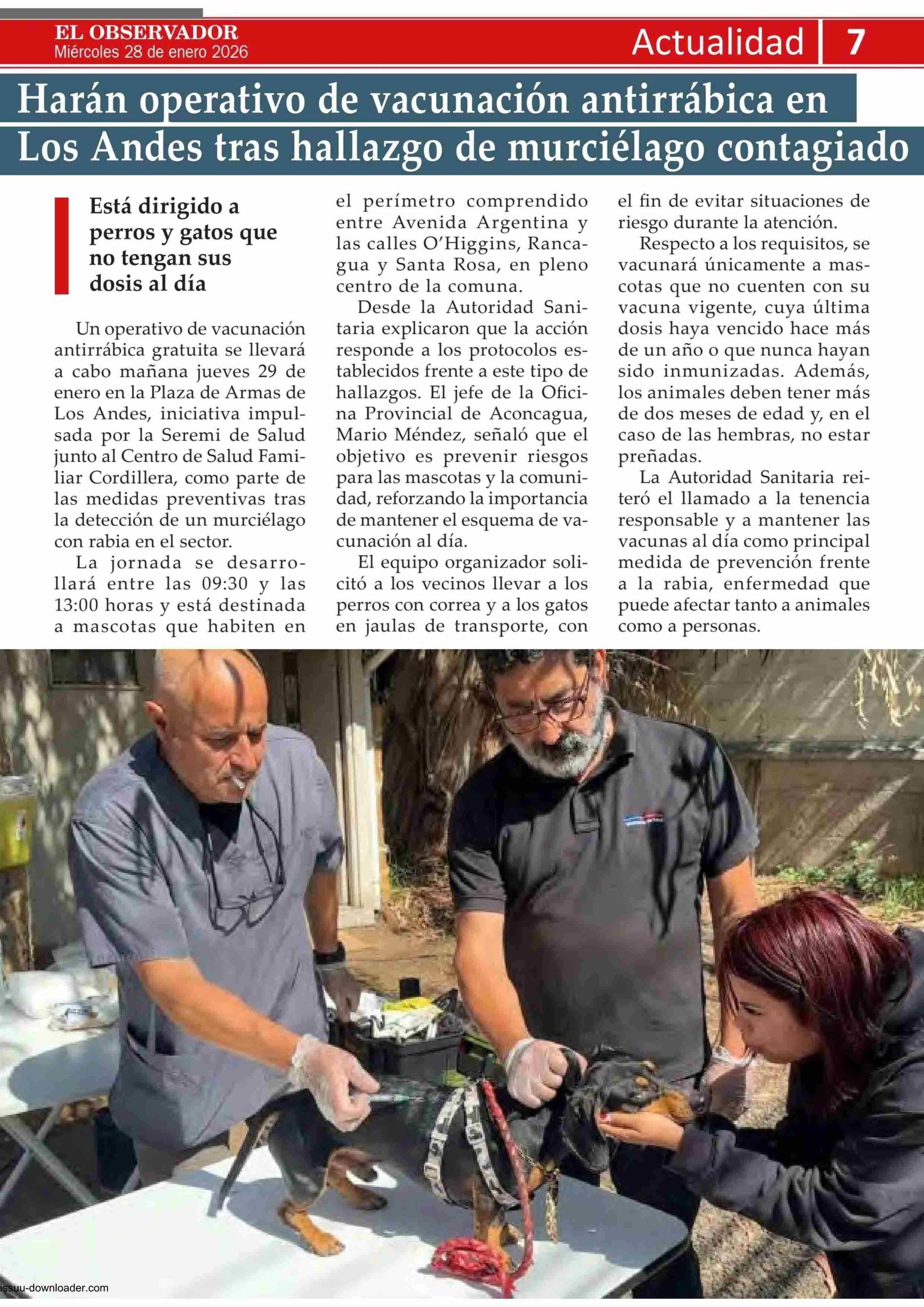 Harán operativo de vacunación antirrábica en Los Andes tras hallazgo de murciélago contagiado 28-01-2026 El Observador Vespertino |