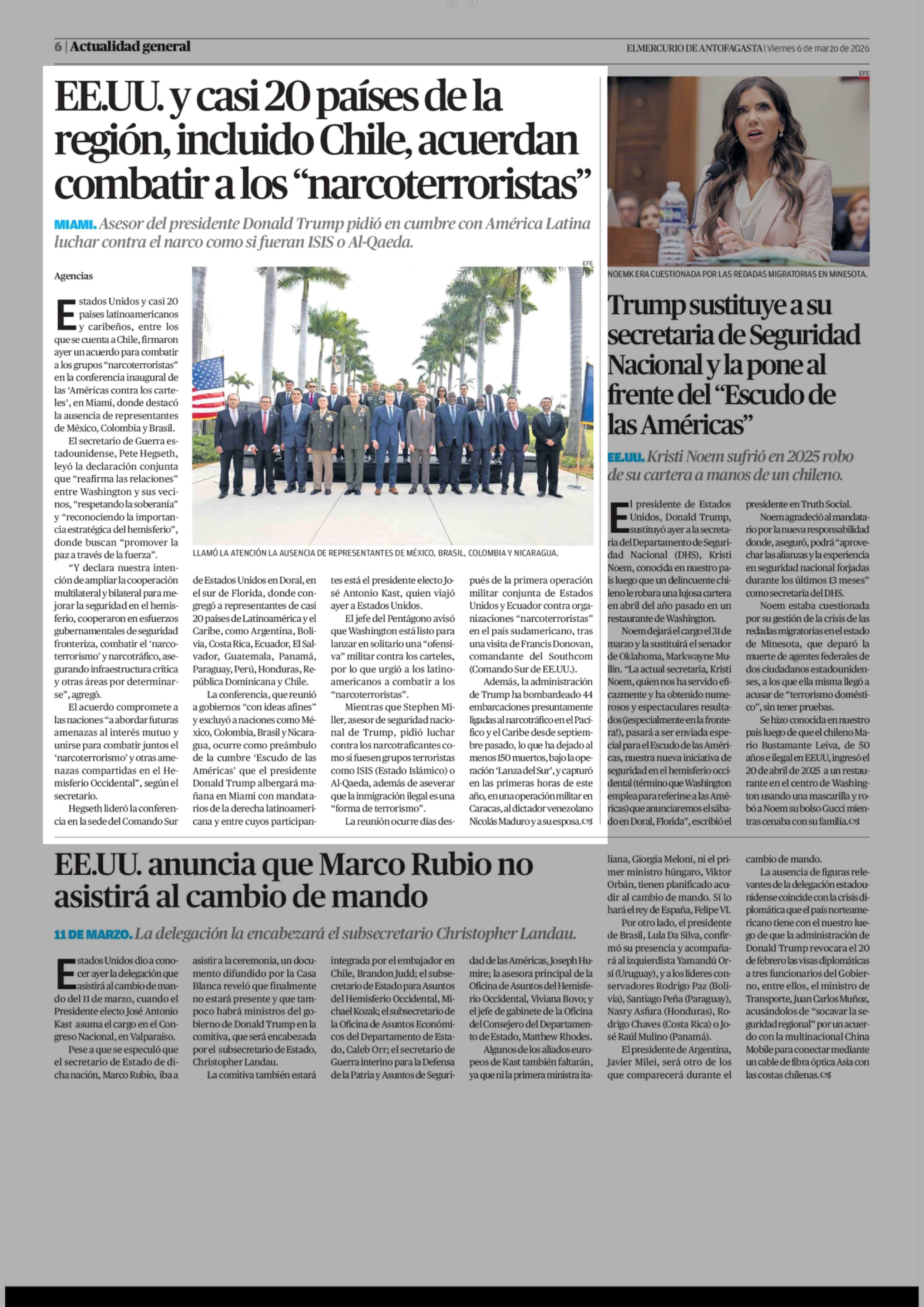 EE.UU. y casi 20 países de la región, incluido Chile, acuerdan combatir a los "narcoterroristas" 06-03-2026 El Mercurio de Antofagasta |