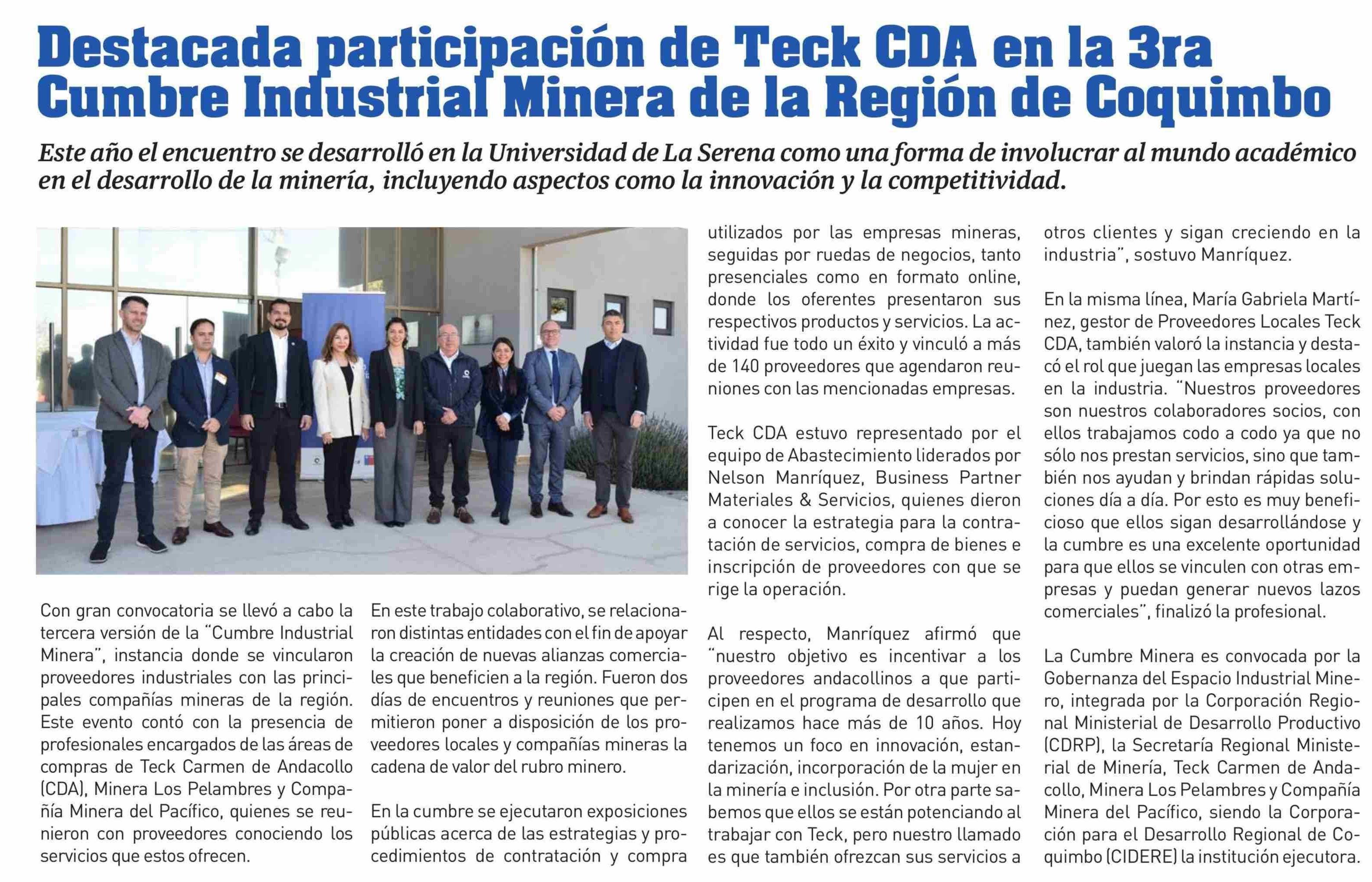 Destacada participación de Teck CDA en la 3ra Cumbre Industrial Minera de la Región de Coquimbo 14-08-2023 El Día |