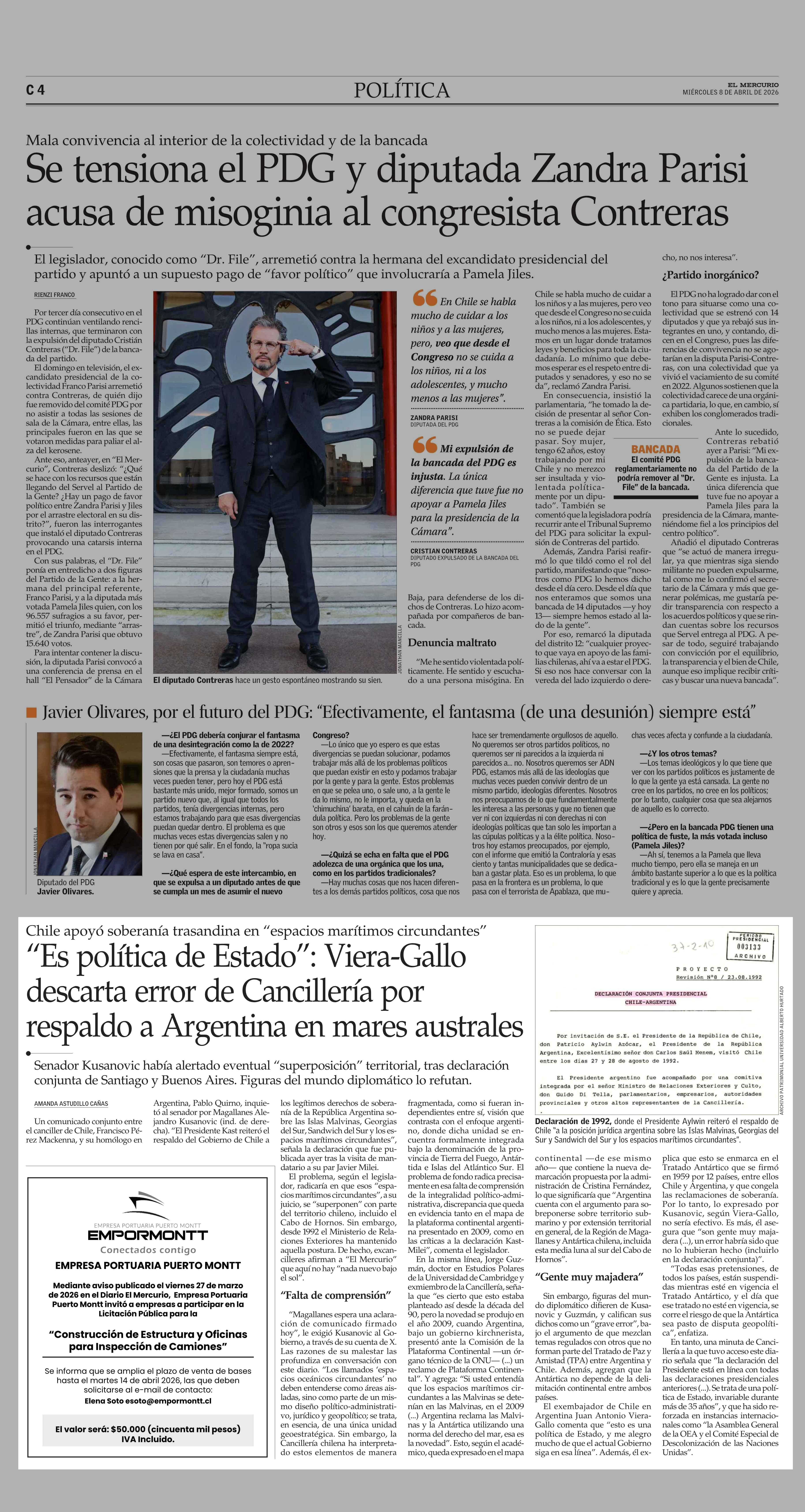 “Es política de Estado”: Viera-Gallo descarta error de Cancillería por respaldo a Argentina en mares australes 08-04-2026 El Mercurio |