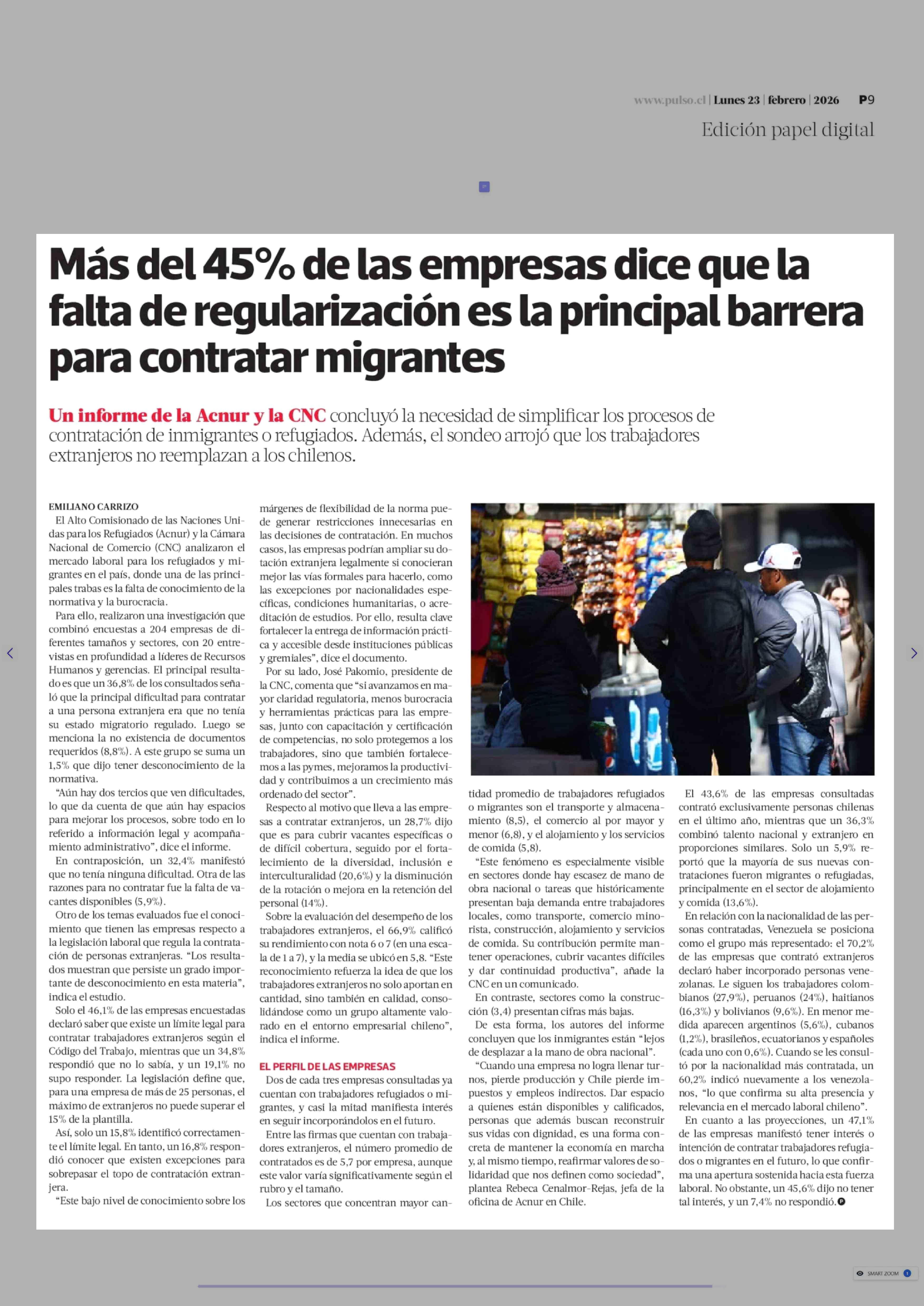 Más del 45% de las empresas dice que la falta de regularización es la principal barrera para contratar migrantes 23-02-2026 La Tercera |