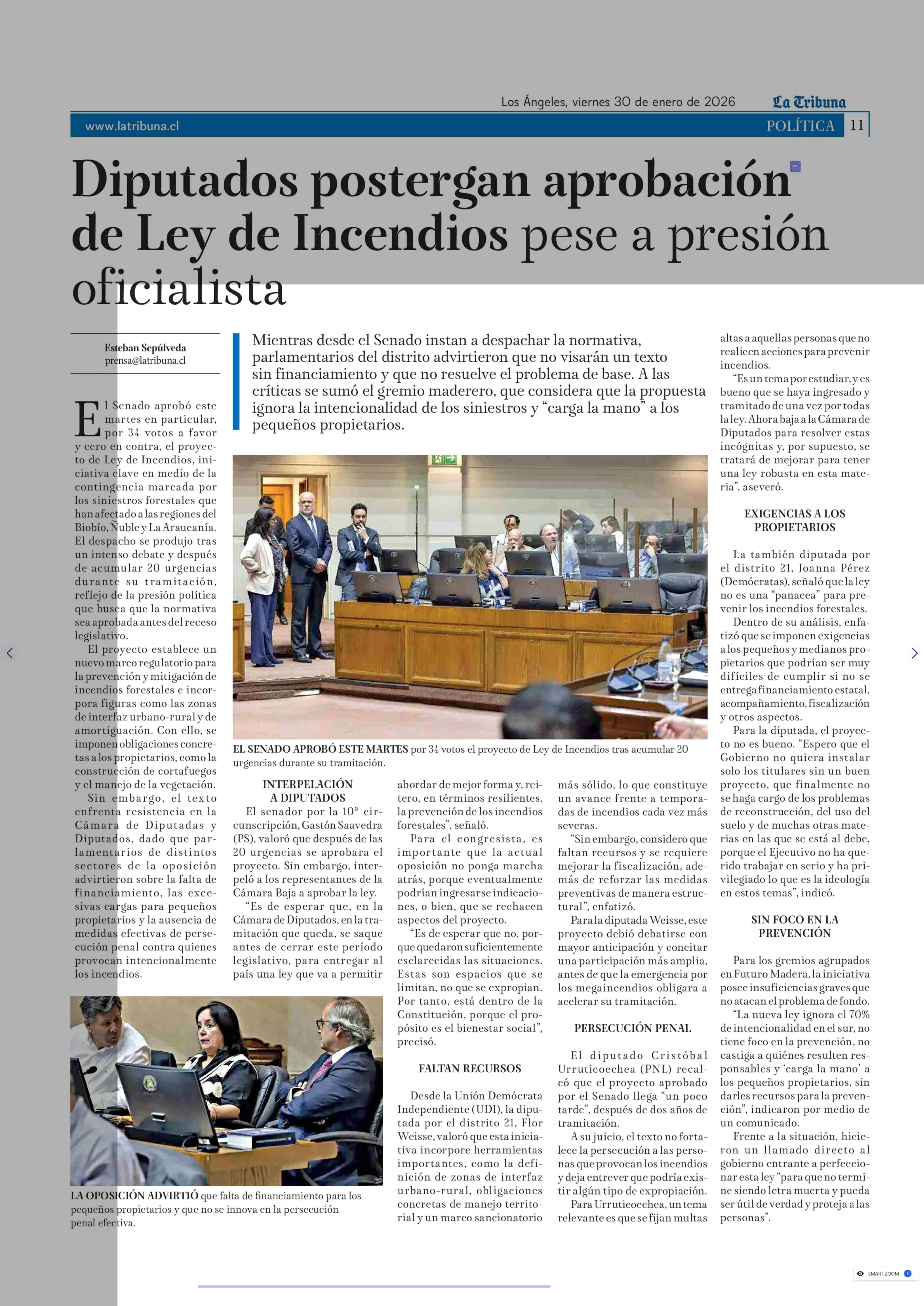 Diputados postergan aprobación de Ley de Incendios pese a presión oficialista 30-01-2026 La Tribuna |