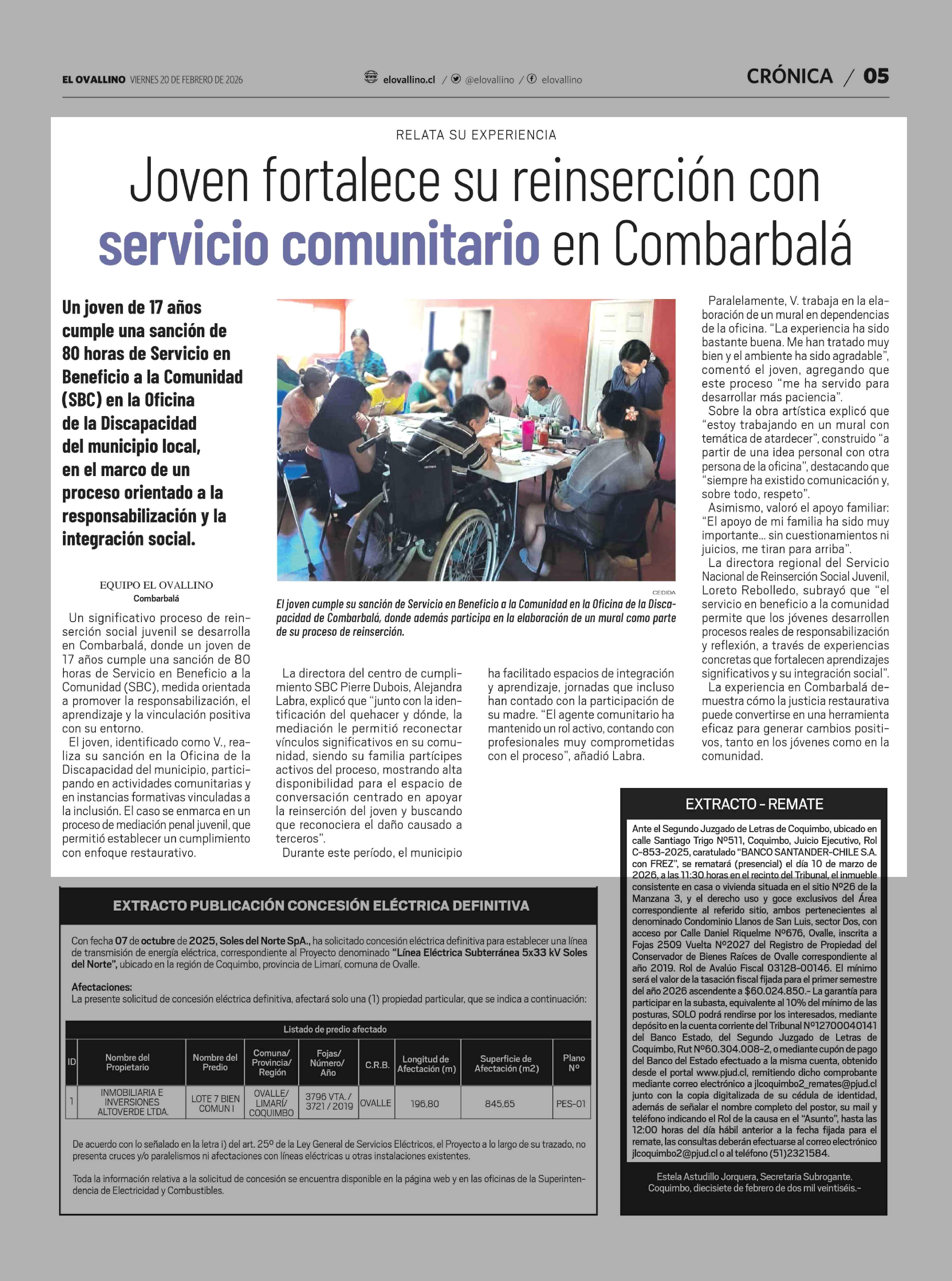 Joven fortalece su reinserción con servicio comunitario en Combarbalá 20-02-2026 El Ovallino |