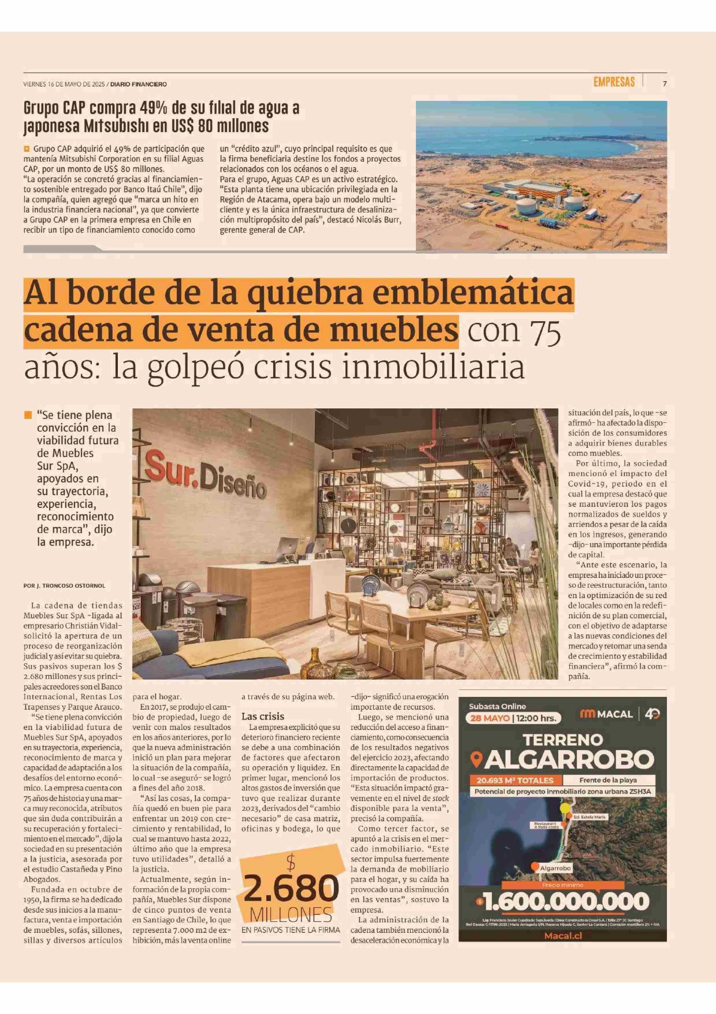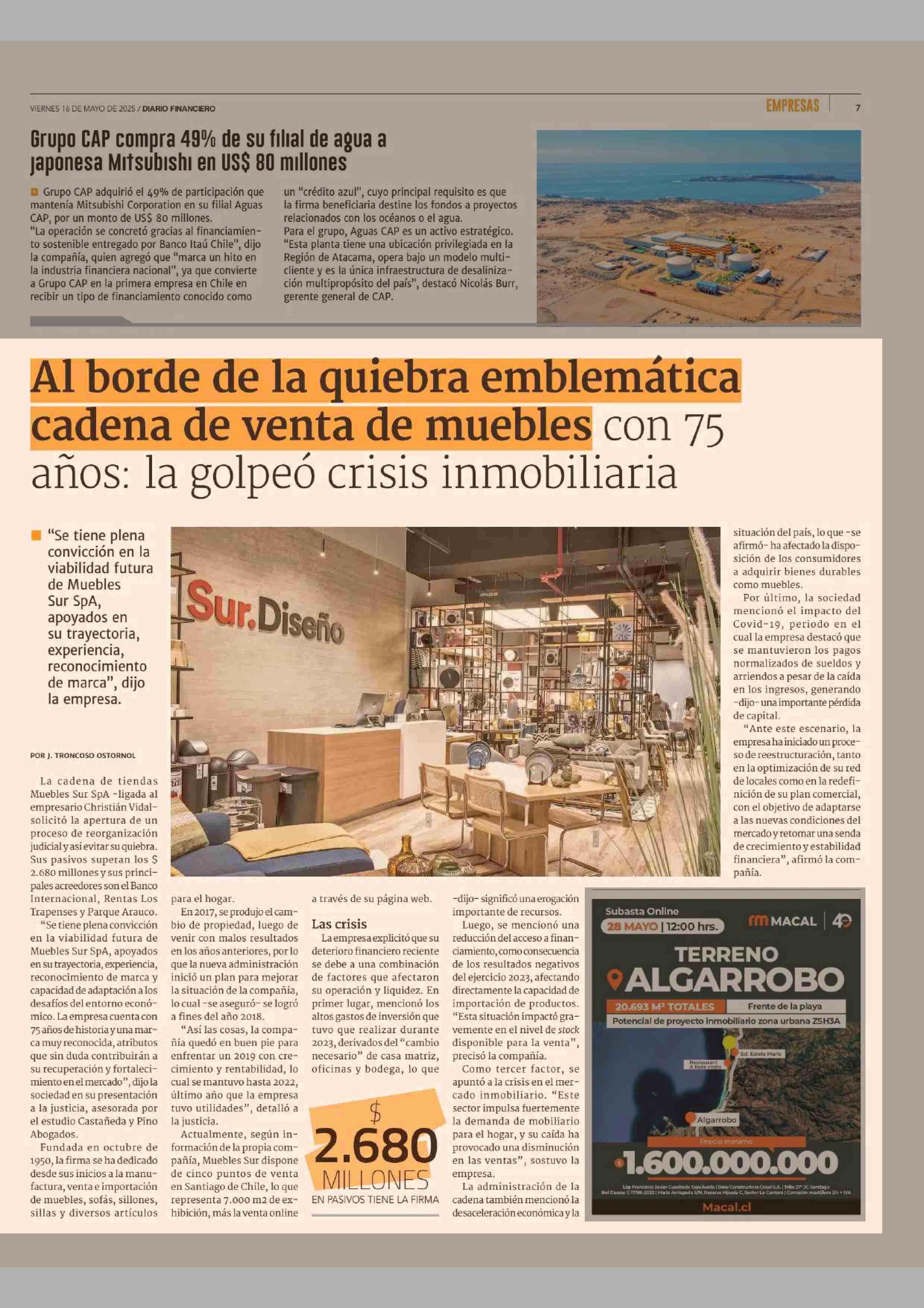 Al borde de la quiebra emblemática cadena de venta de muebles con 75 años: la golpeó crisis inmobiliaria 16-05-2025 Diario Financiero |