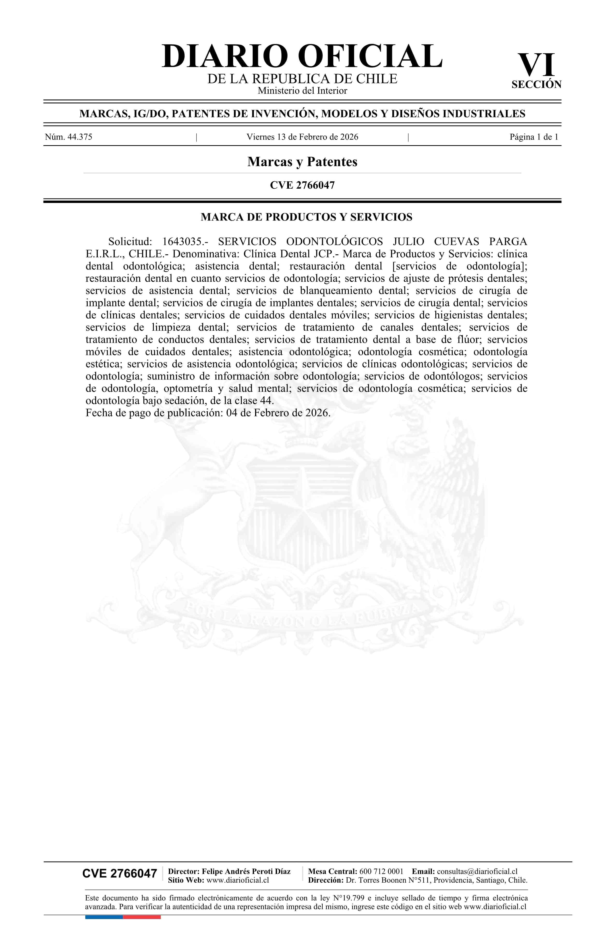 Solicitud número 1643035.- Clínica Dental JCP 13-02-2026 Diario Oficial Edición Electrónica |