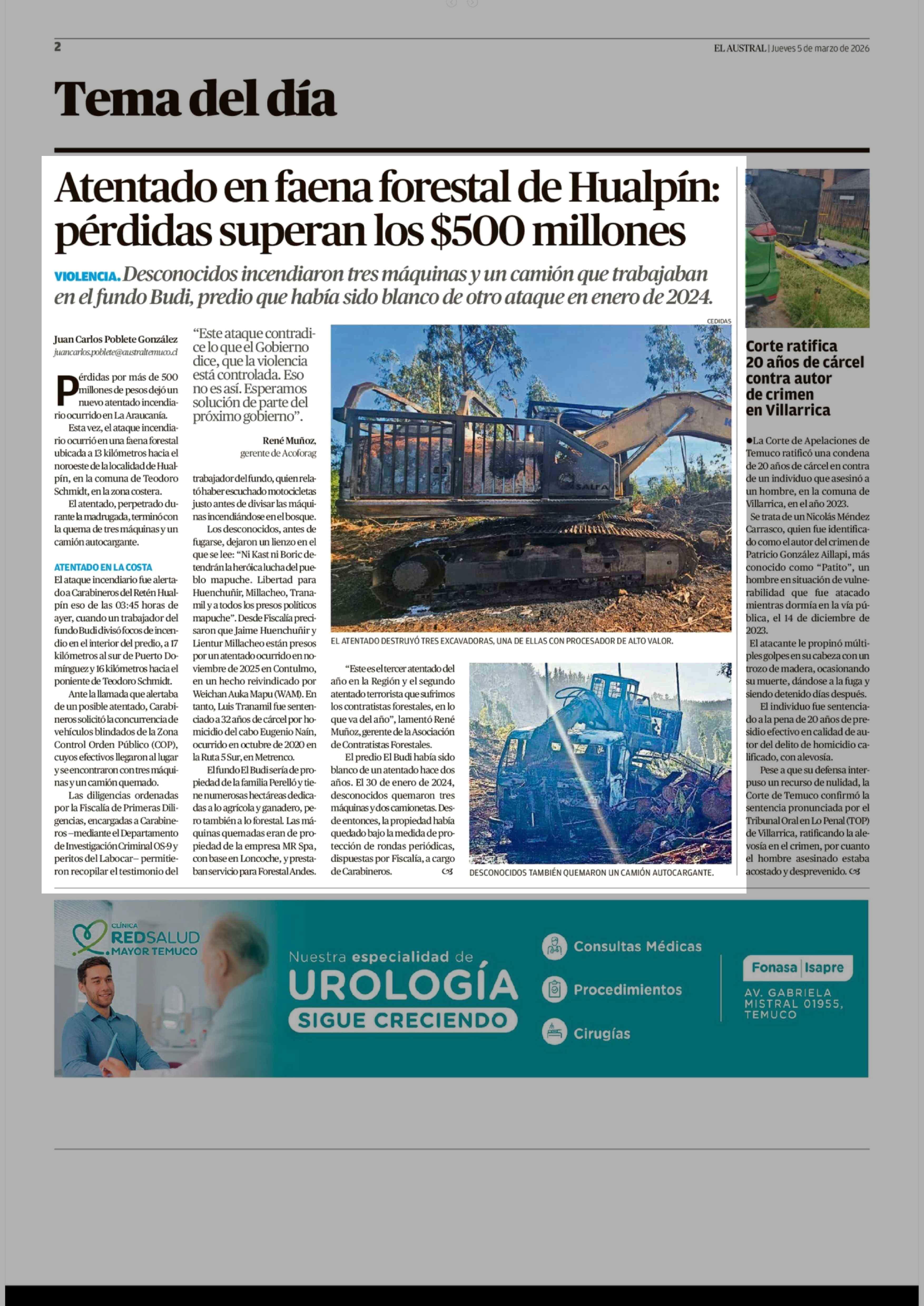 Título: Atentado en faena forestal de Hualpín: pérdidas superan los $500 millones