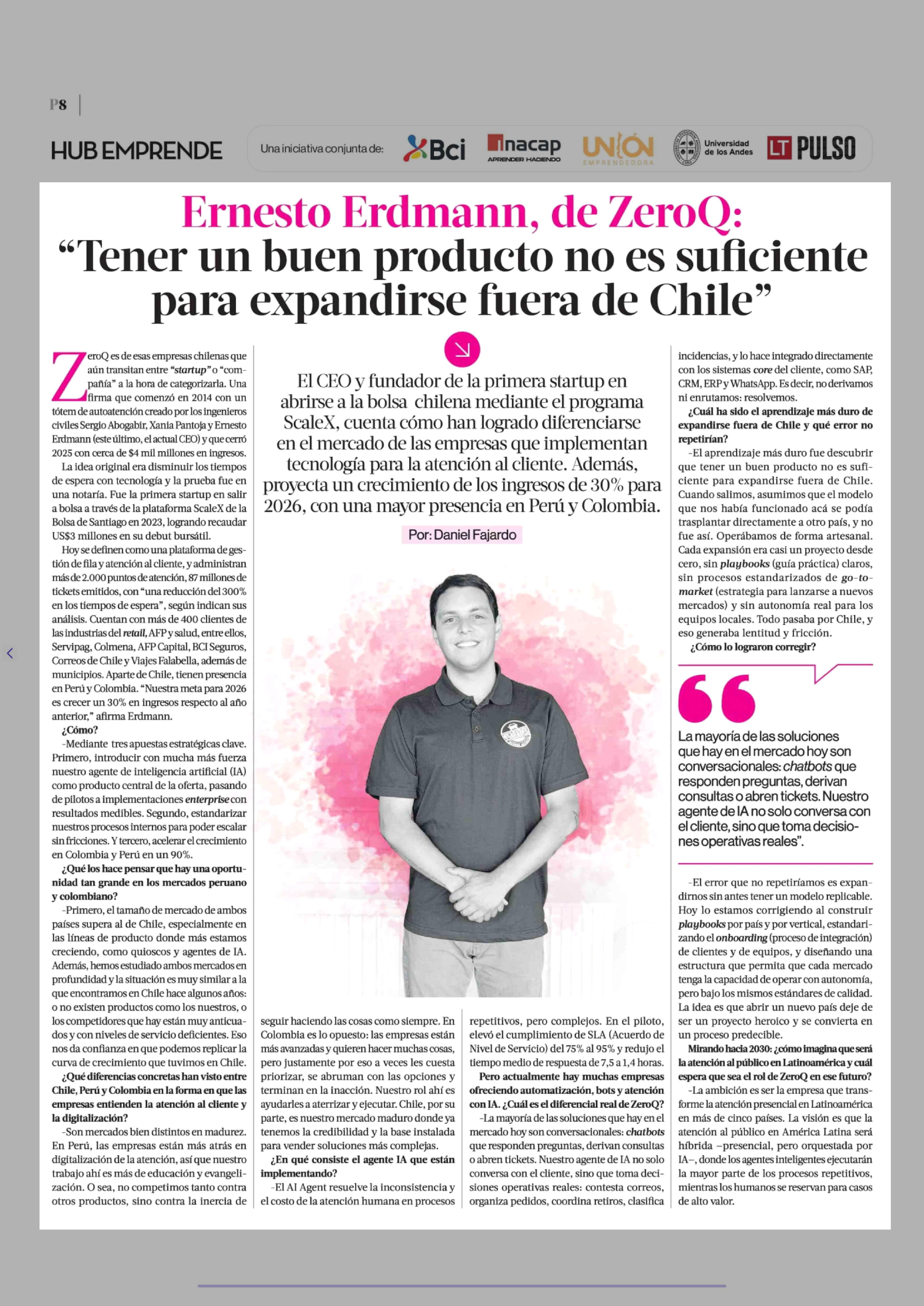 Título: Ernesto Erdmann, de ZeroQ: "Tener un buen producto no es suficiente para expandirse fuera de Chile" 7 eroQ es de esas empresas chilenas que aún transitan entre "startup" o "compañía” a la hora de categorizarla. Una firma que comenzó en 2014 con un tótem de autoatención creado por los ingenieros inci
