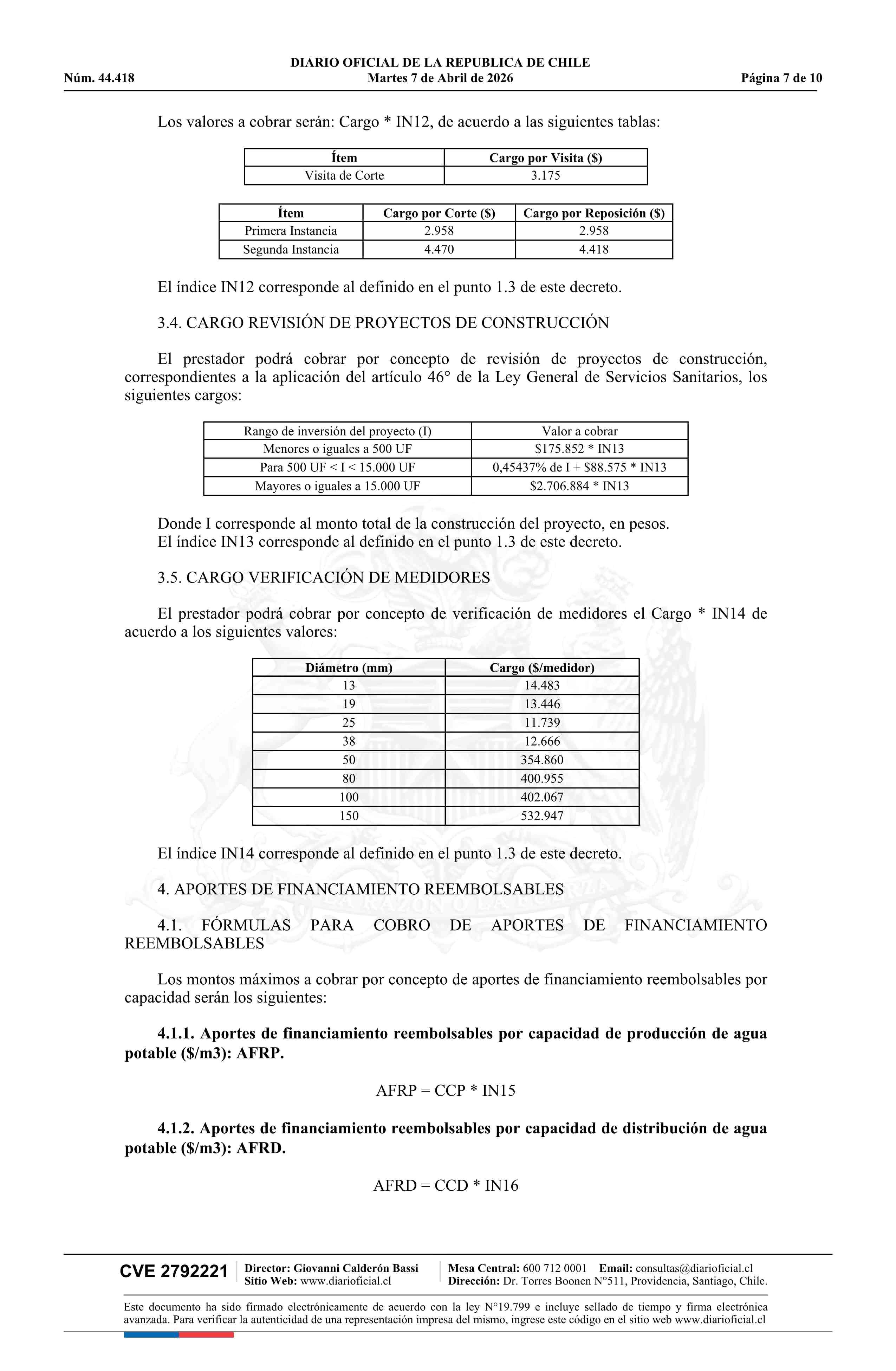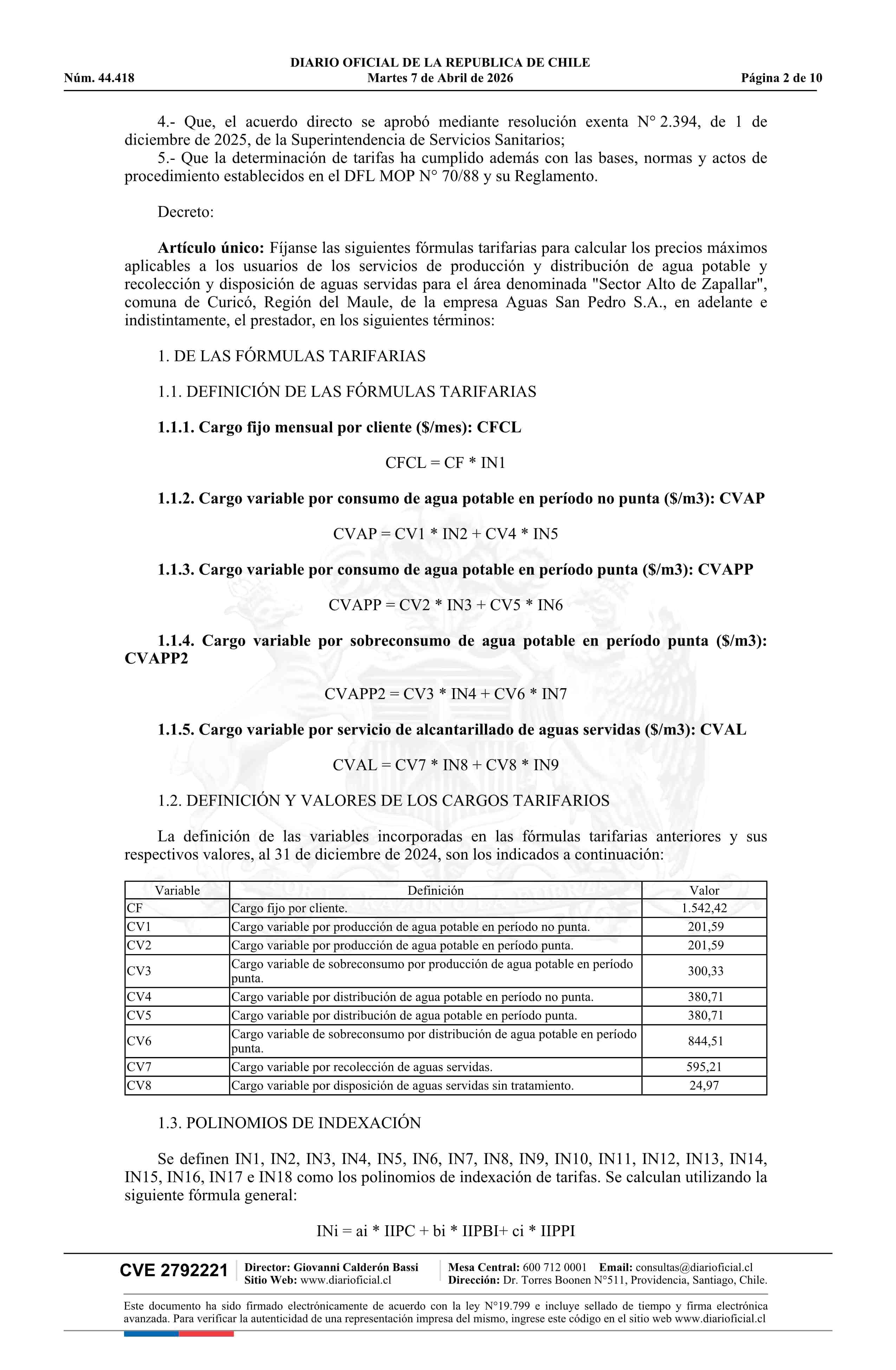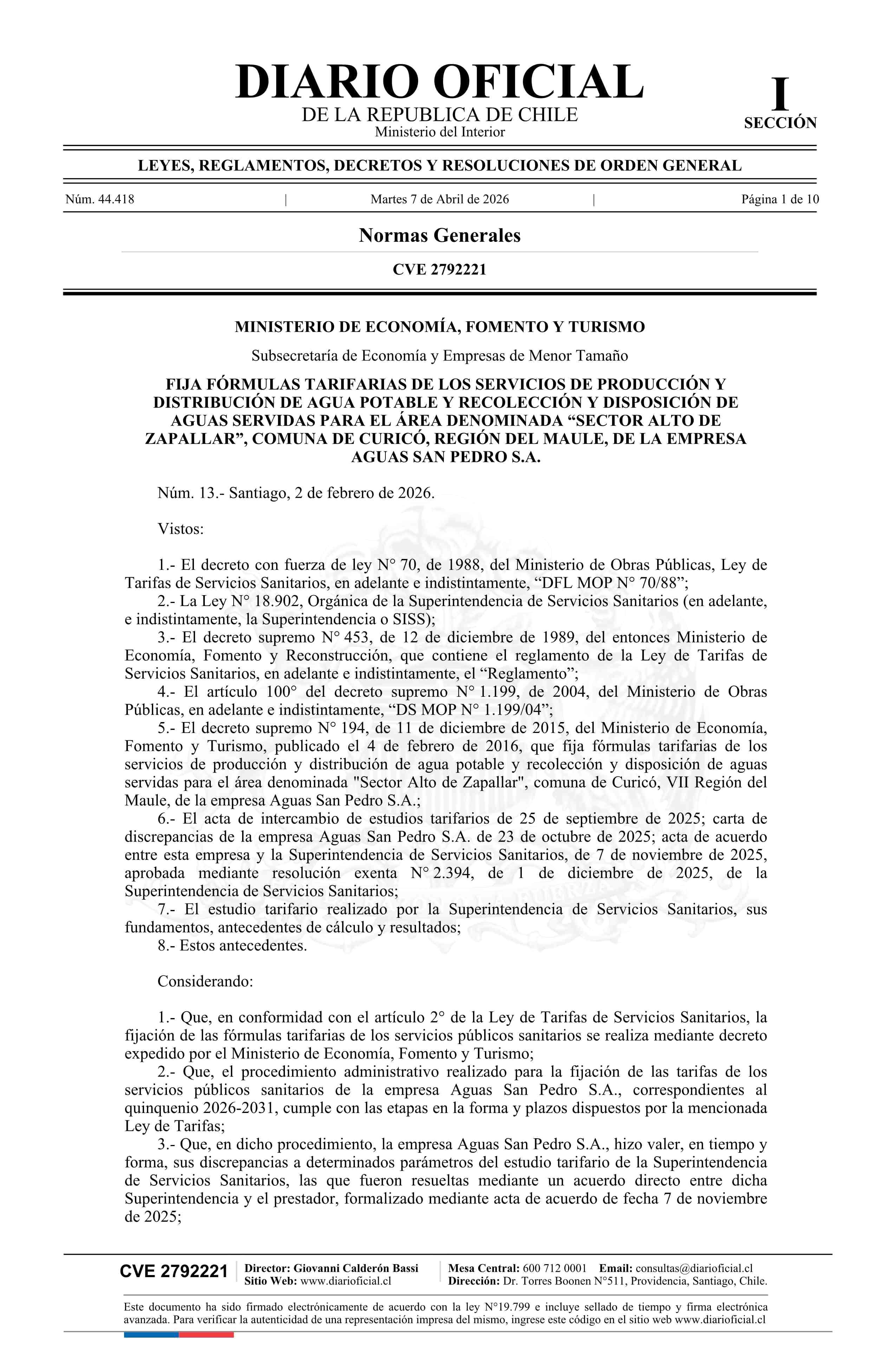 | Título: | Decreto número 13, de 2026.- Fija fórmulas tarifarias de los servicios de producción y distribución de agua potable y recolección y disposición de aguas servidas para el área denominada Sector Alto de Zapallar, comuna de Curicó, Región del Maule, de la empresa Aguas San Pedro S.A. |