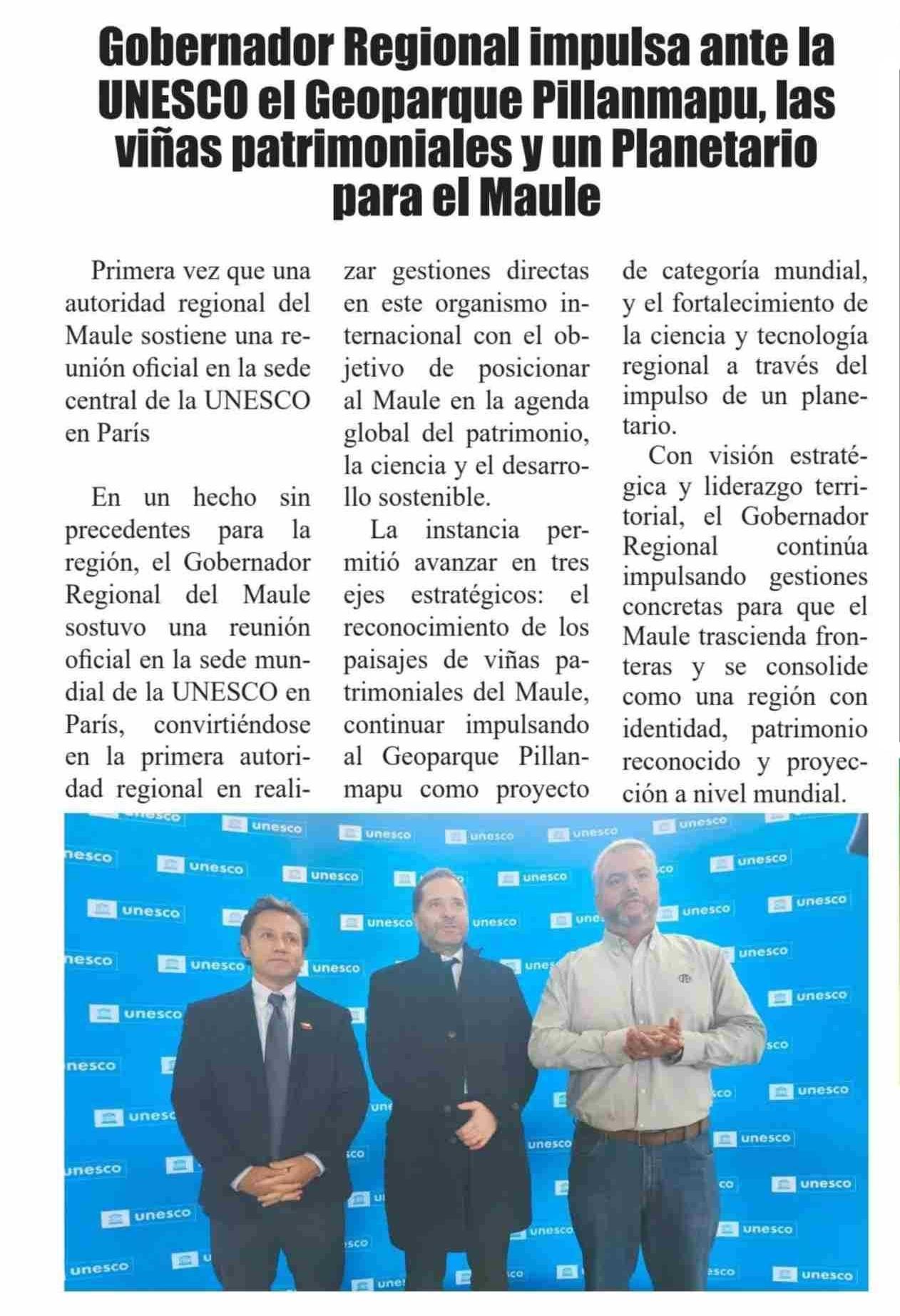 Gobernador Regional impulsa ante la UNESCO el Geoparque Pillanmapu, las viñas patrimoniales y un Planetario para el Maule 14-02-2026 El Heraldo |