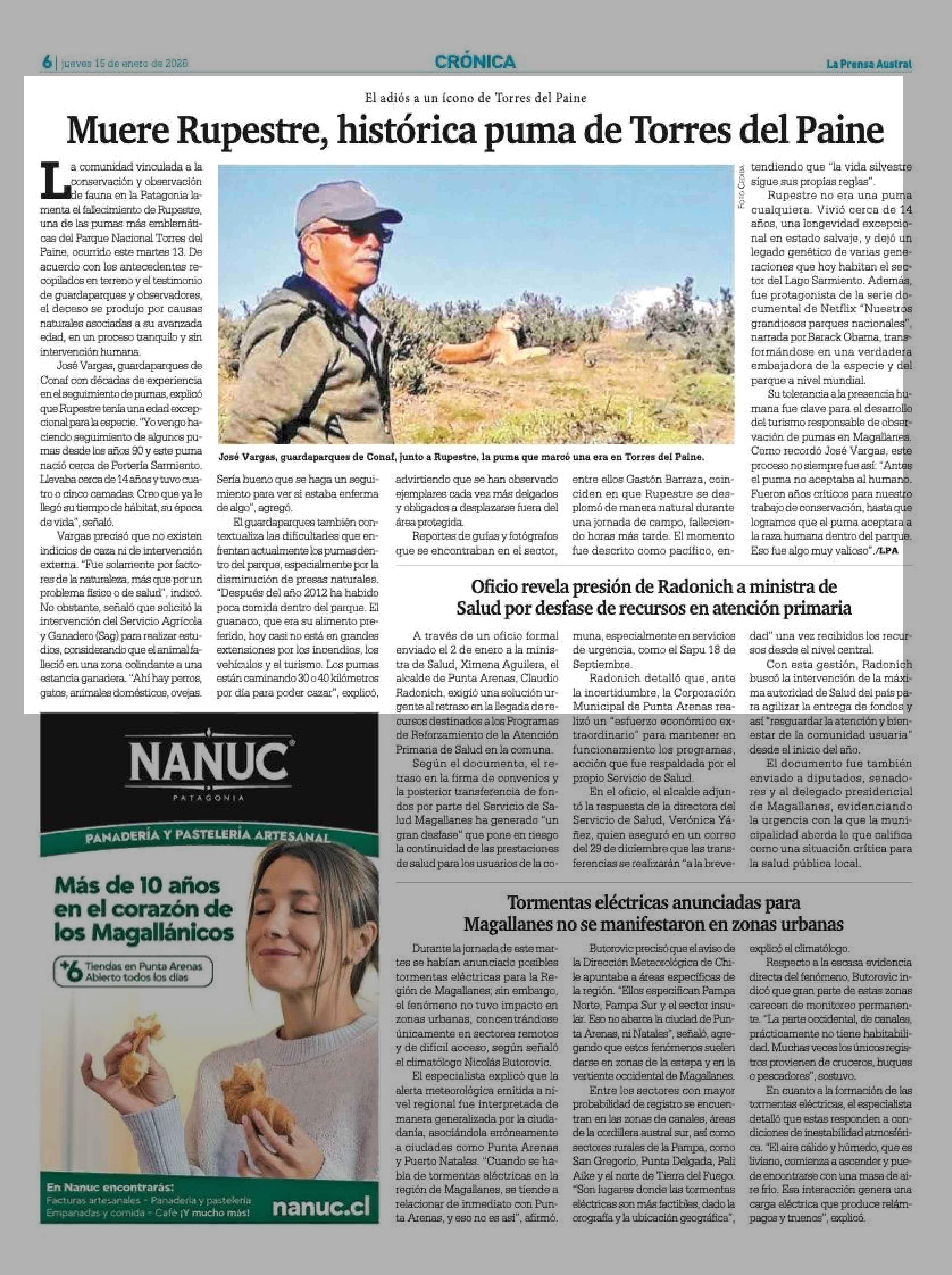 Muere Rupestre, histórica puma de Torres del Paine 15-01-2026 La Prensa Austral |