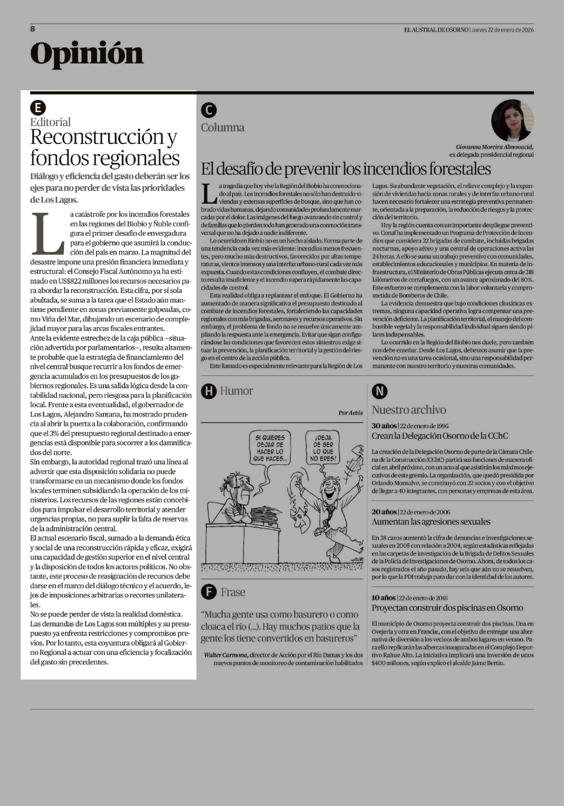 Editorial: Reconstrucción y fondos regionales 22-01-2026 El Austral de Osorno |