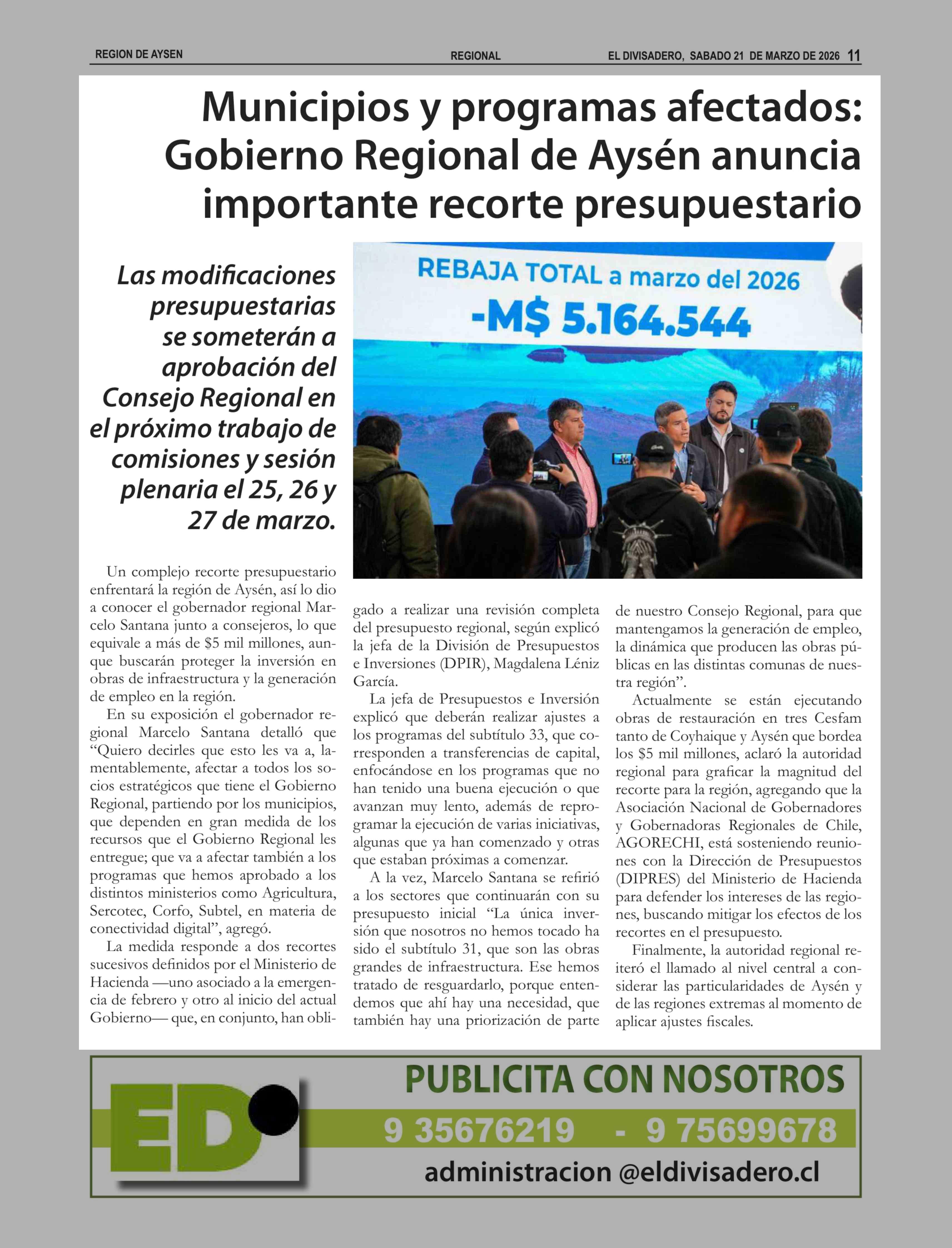 | Título: | Municipios y programas afectados: Gobierno Regional de Aysén anuncia importante recorte presupuestario |