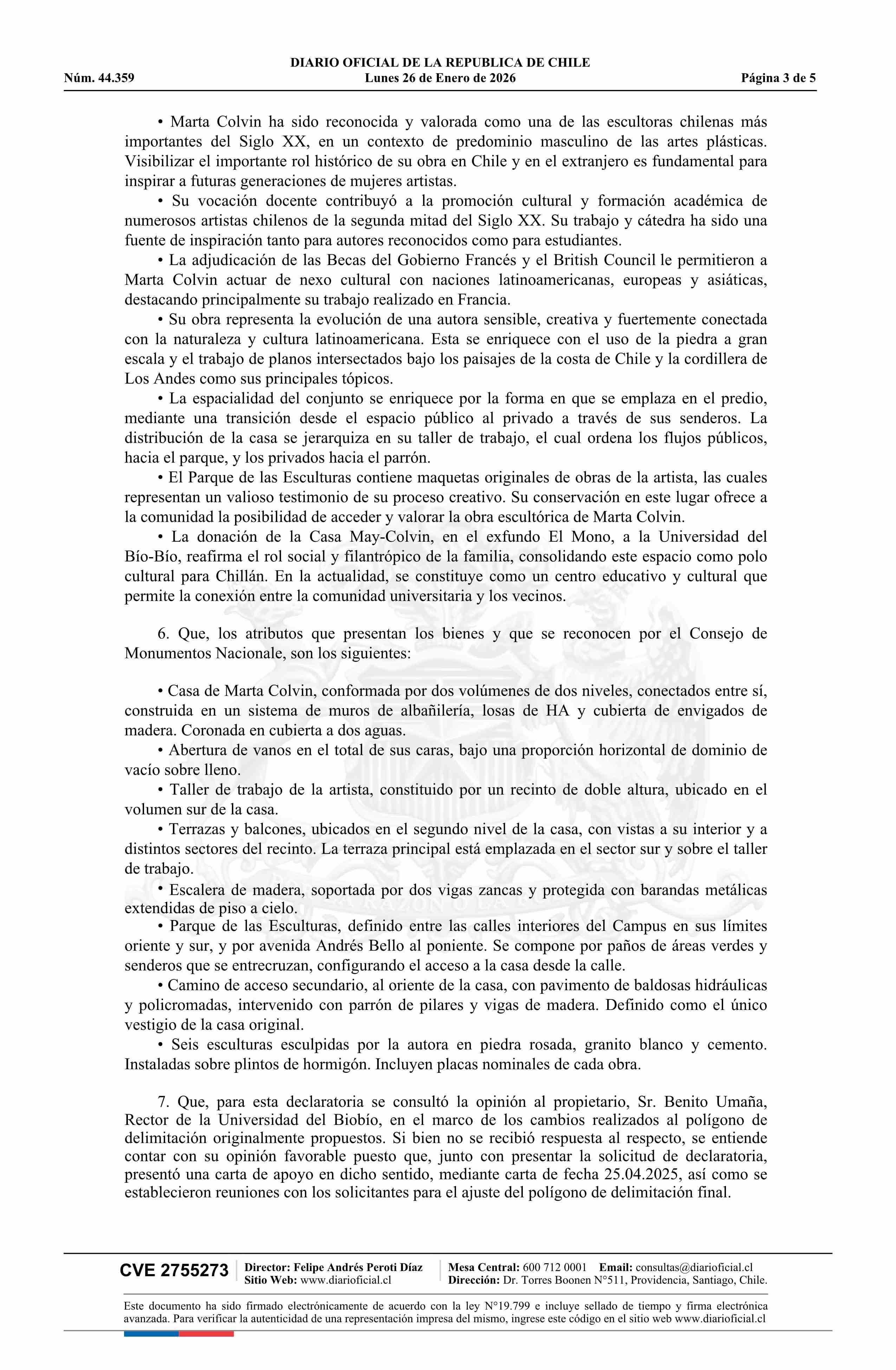 Decreto exento número 2, de 2026.- Declara Monumento Nacional, en la categoría de Monumento Histórico, la Casa y Parque de las Esculturas de Marta Colvin y Fernando May, comuna de Chillán, Región de Ñuble