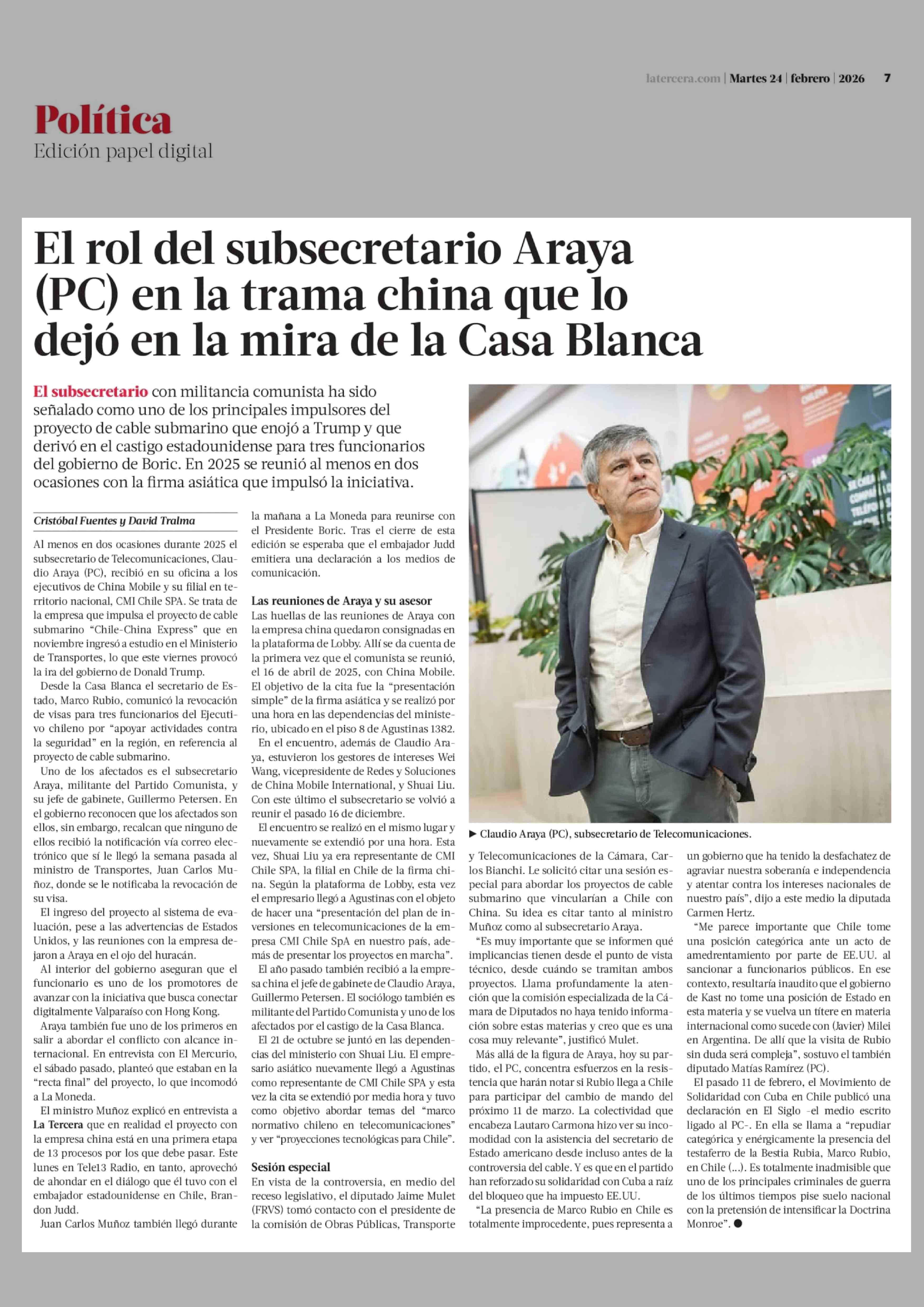 El rol del subsecretario Araya (PC) en la trama china que lo dejó en la mira de la Casa Blanca 24-02-2026 La Tercera |