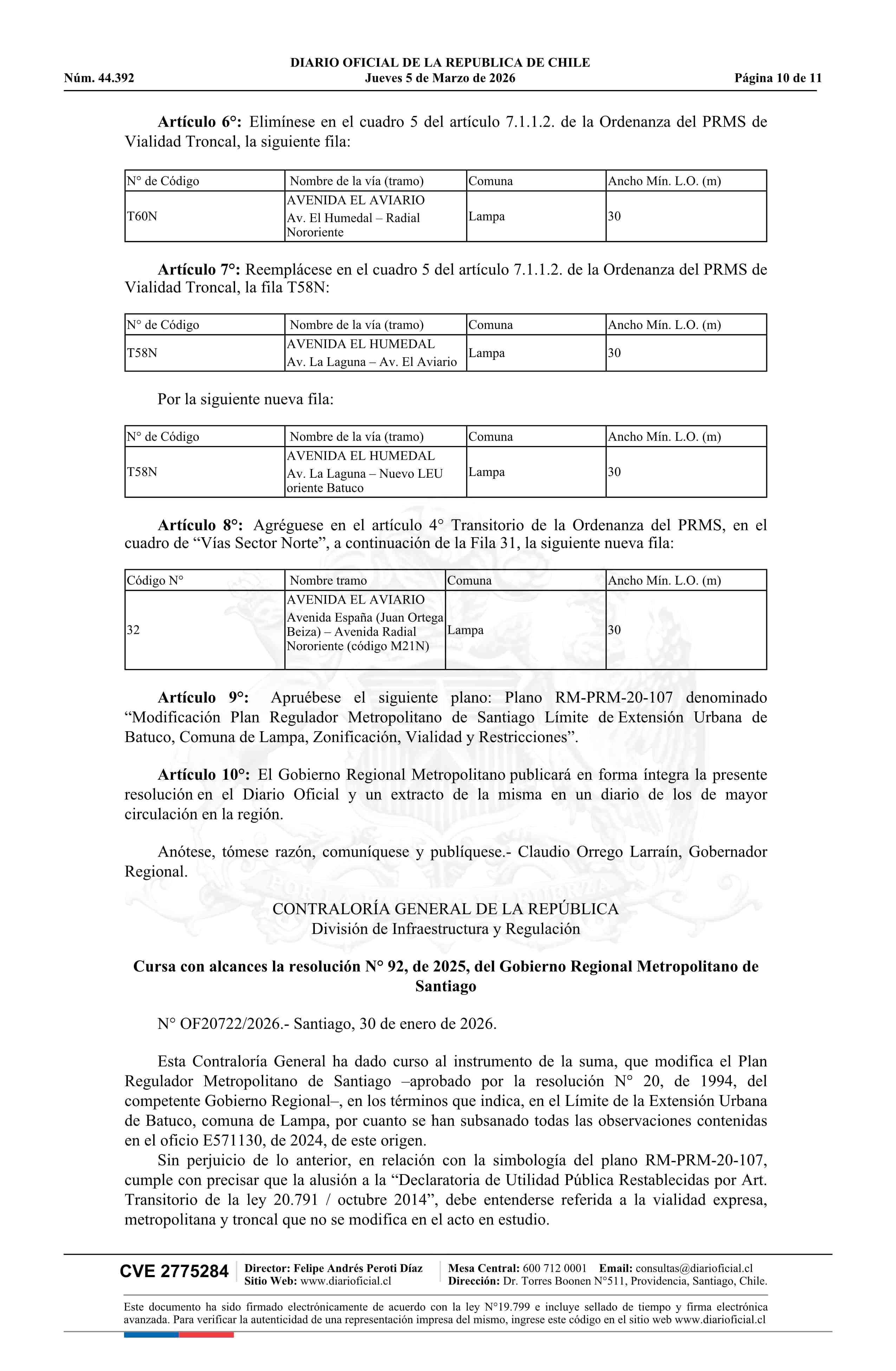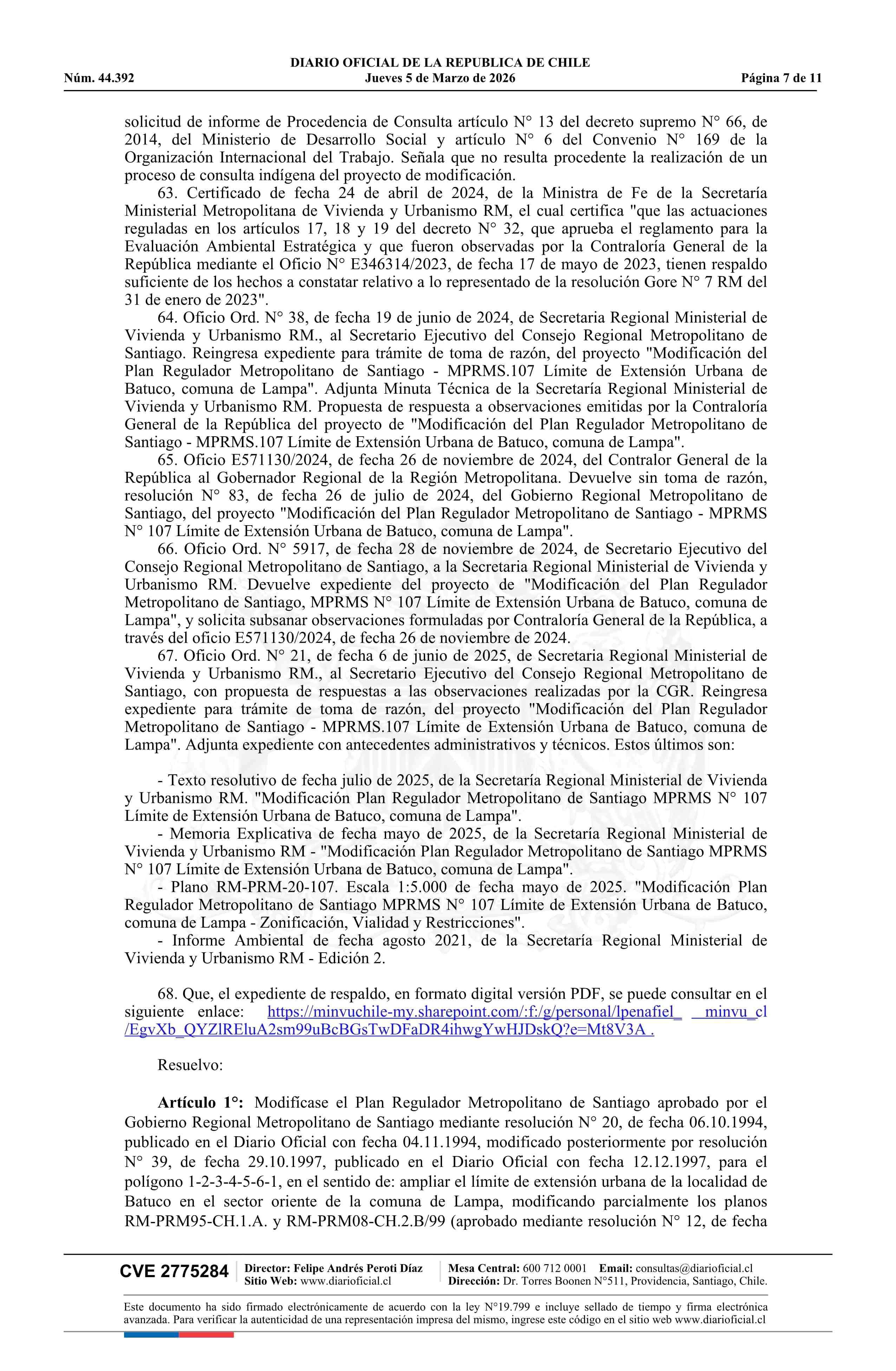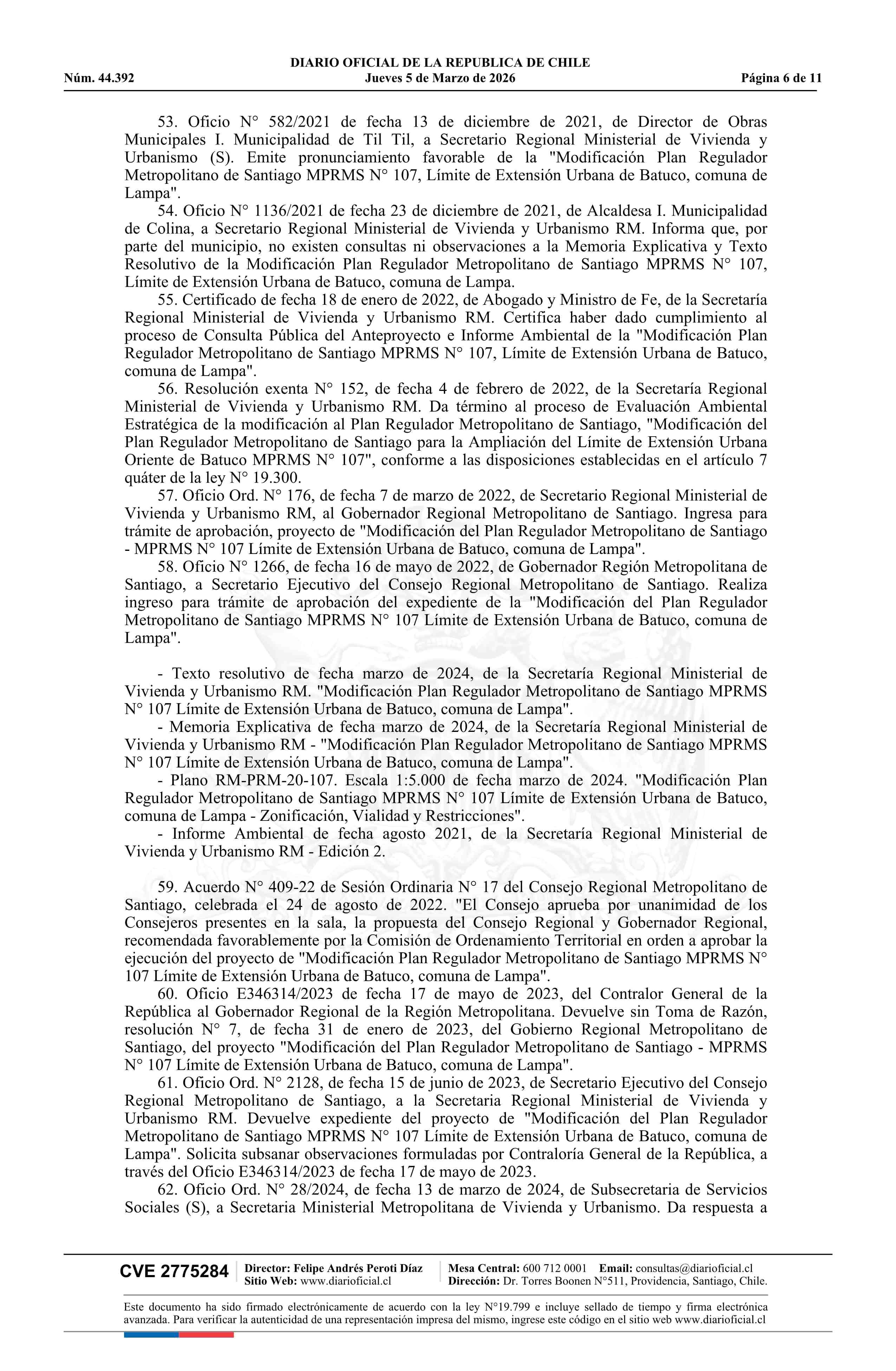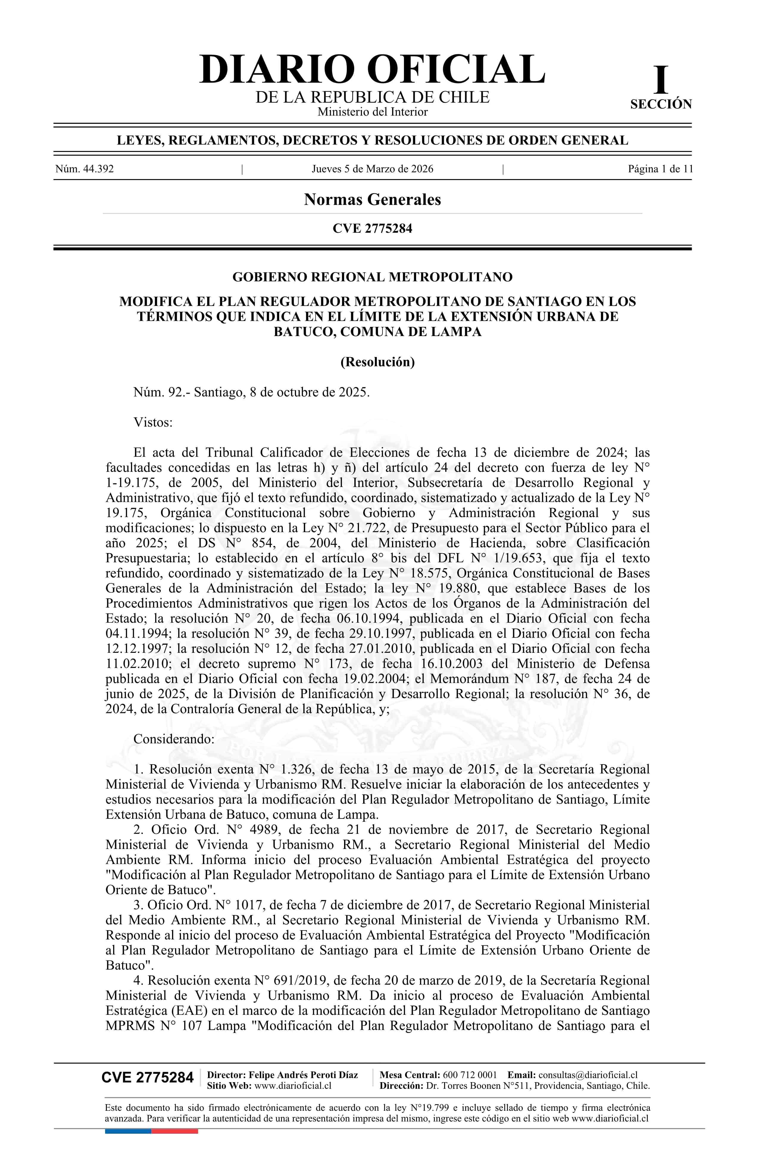 Resolución número 92, de 2025.- Modifica Plan Regulador Metropolitano de Santiago en los términos que indica en el límite de la extensión urbana de Batuco, comuna de Lampa 05-03-2026 Diario Oficial Edición Electrónica |