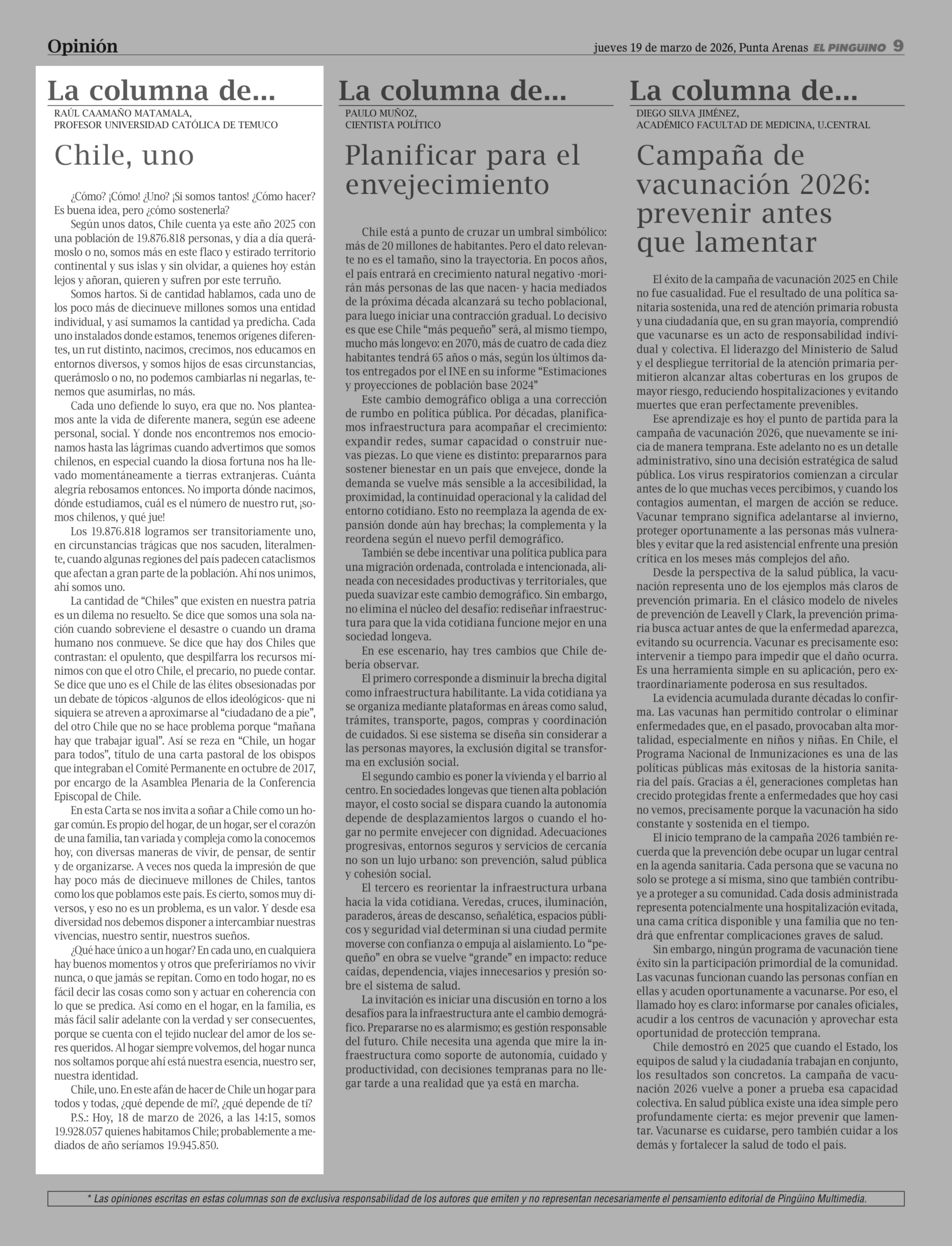 Columnas de Opinión: Chile, uno 19-03-2026 El Pingüino |