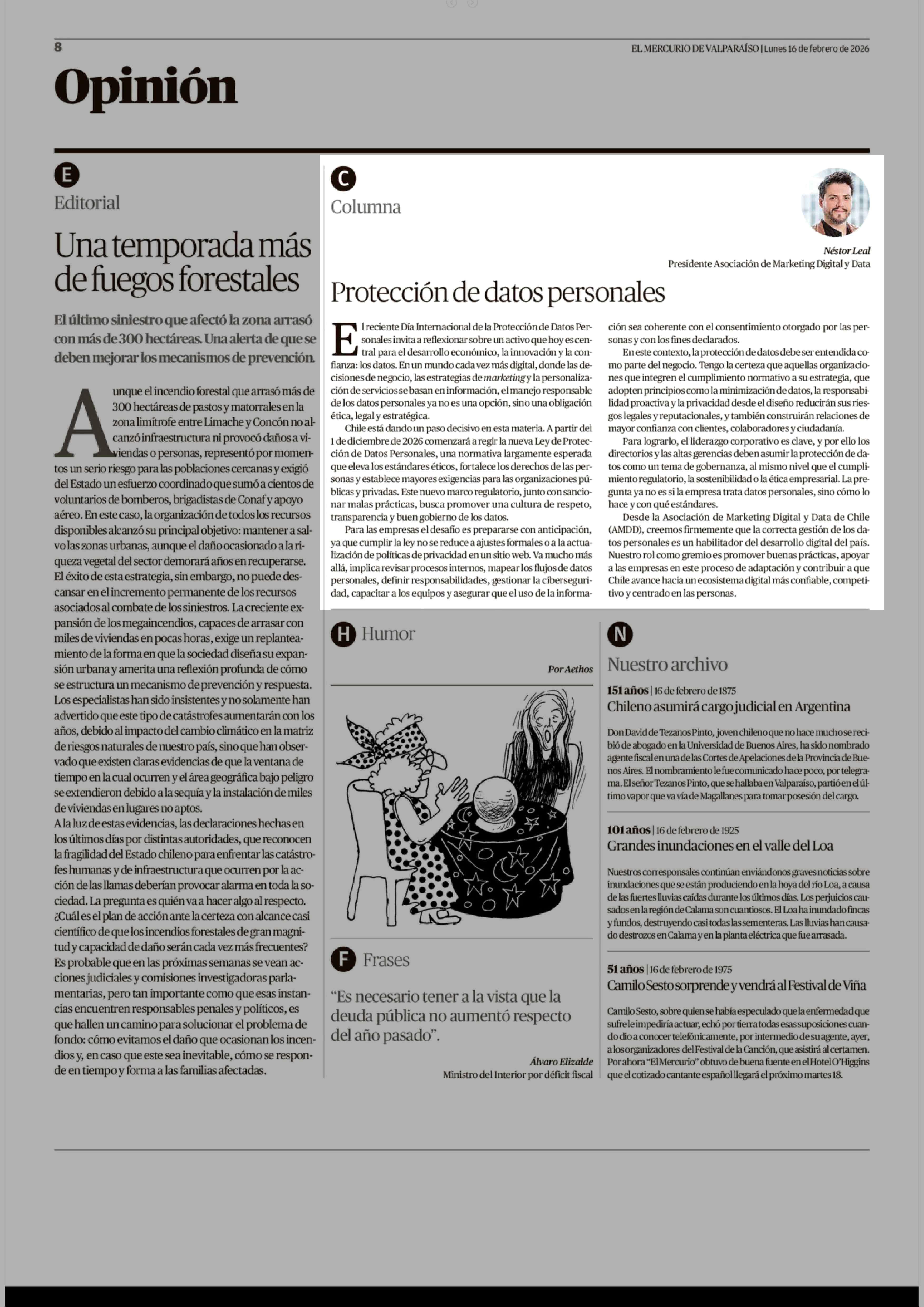 Columnas de Opinión: Protección de datos personales 16-02-2026 El Mercurio de Valparaíso |