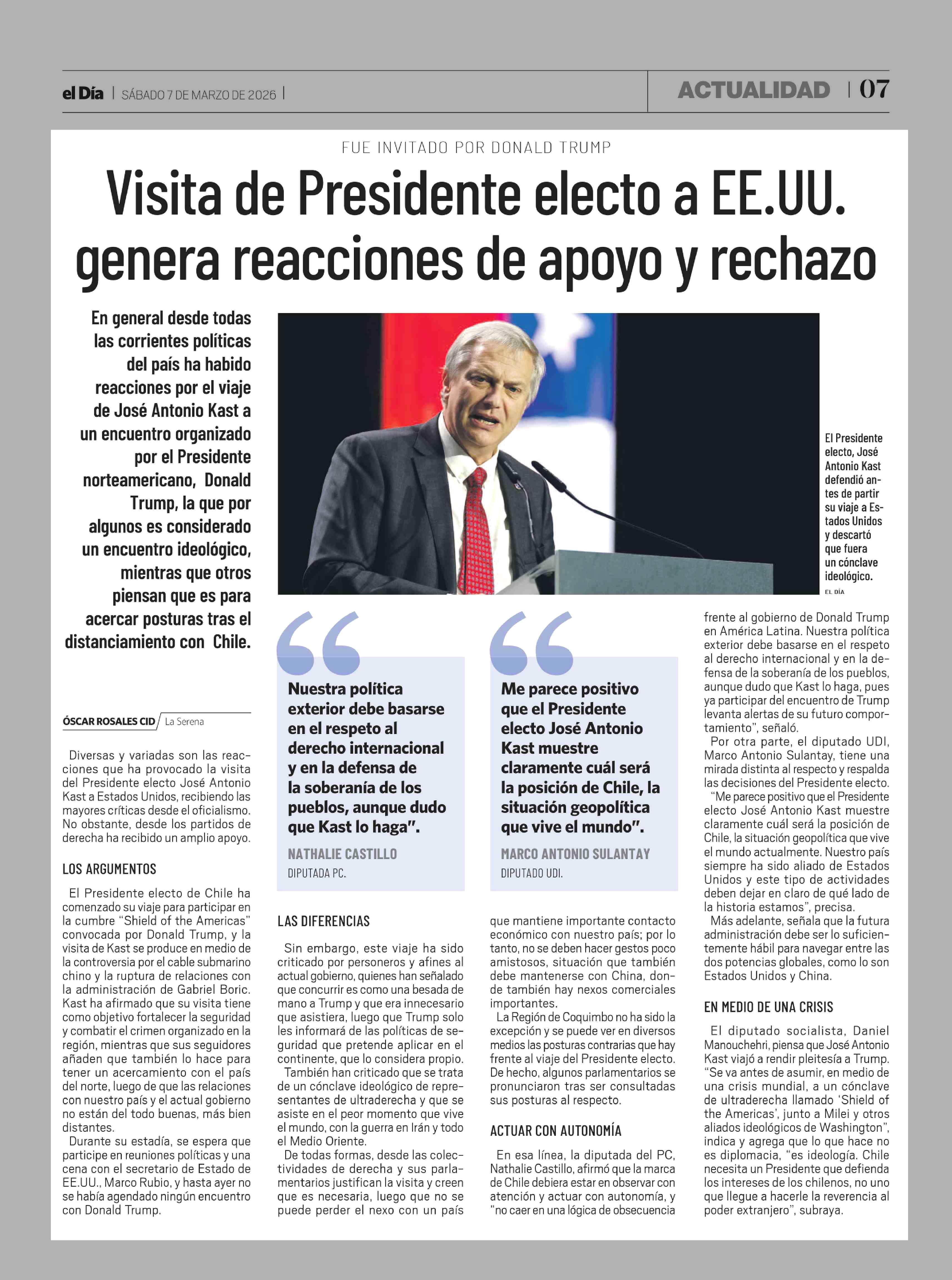 Visita de Presidente electo a EE.UU. genera reacciones de apoyo y rechazo 07-03-2026 El Día |