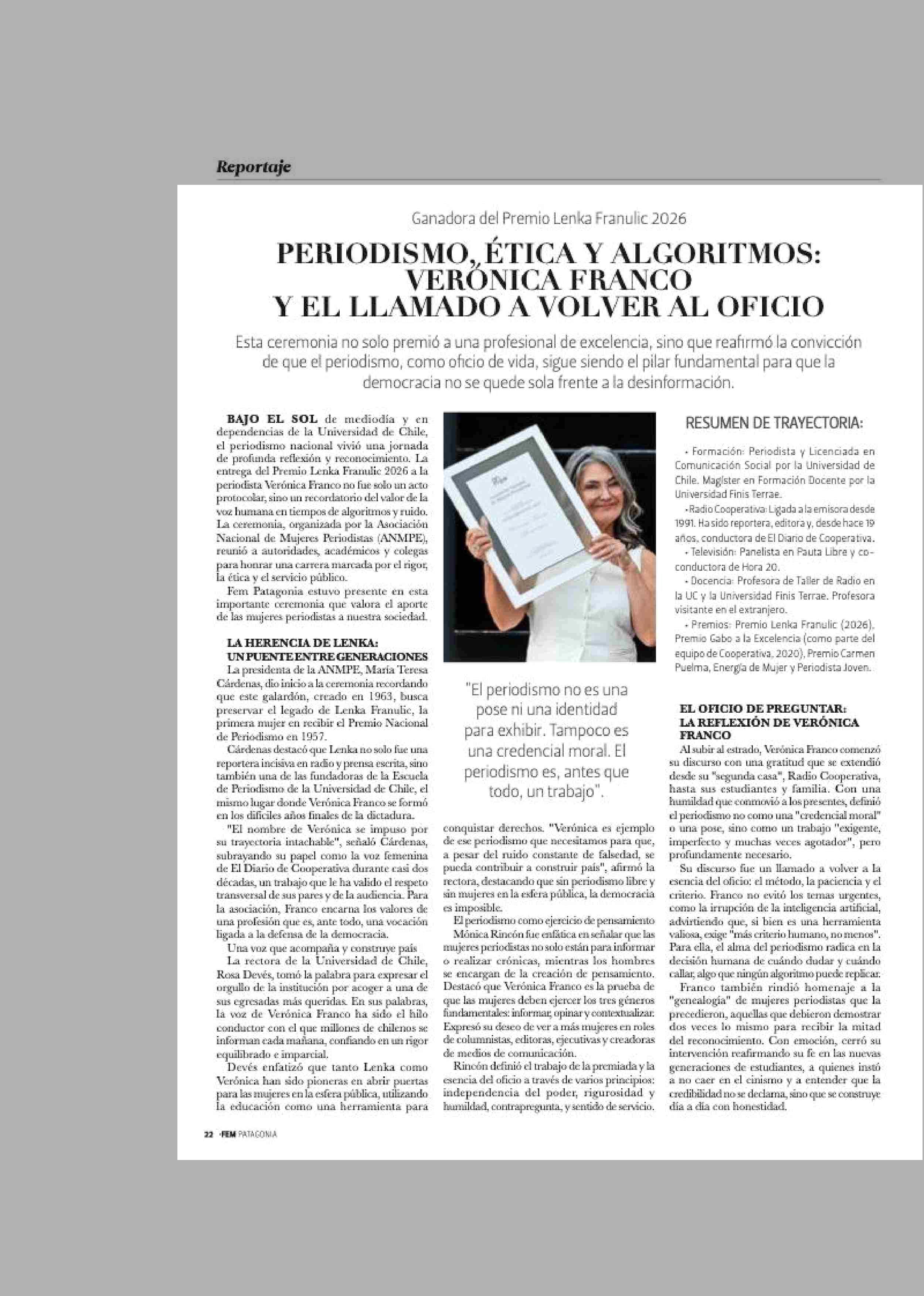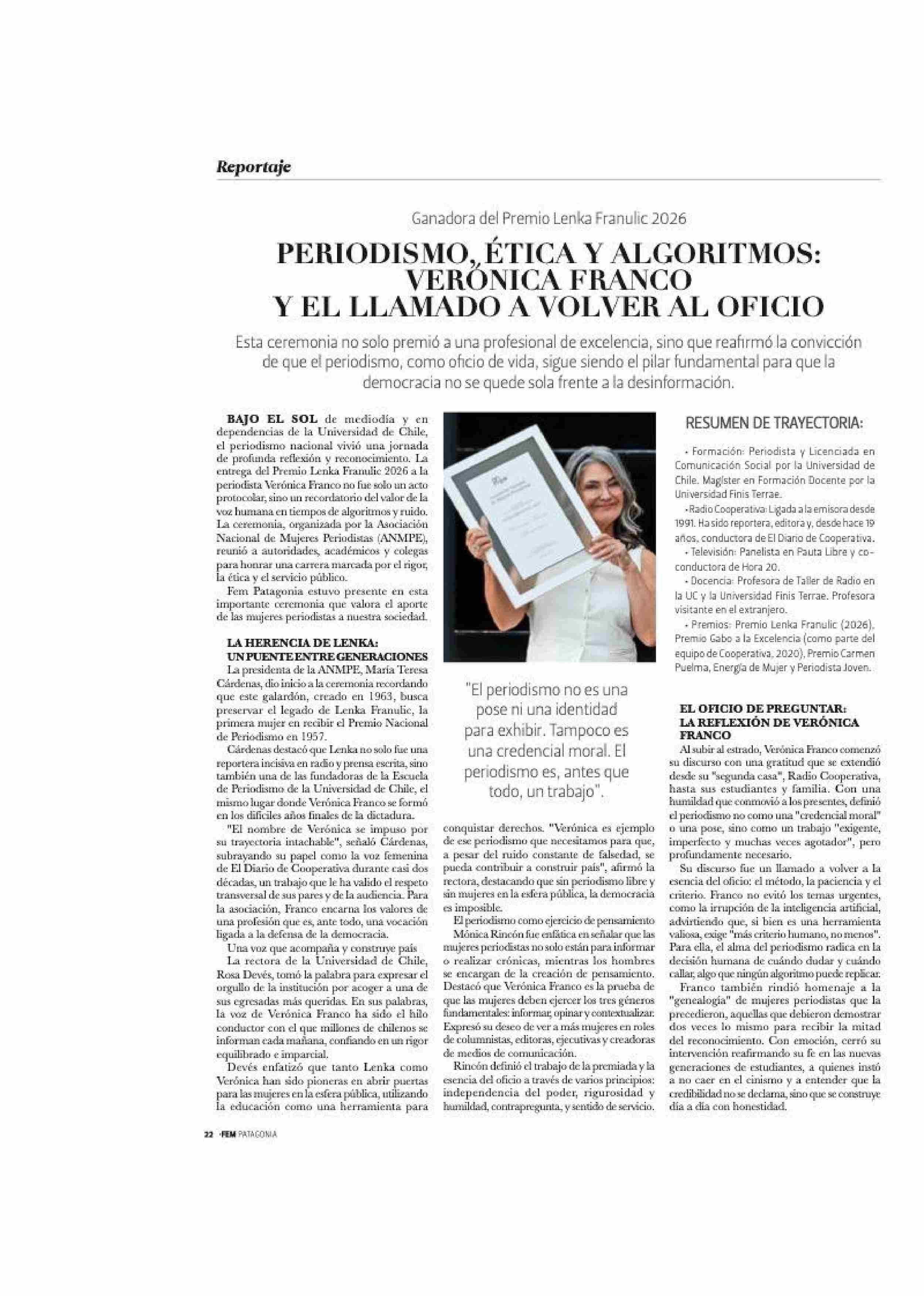 PERIODISMO, ÉTICA Y ALGORITMOS: VERÓNICA FRANCO Y EL LLAMADO A VOLVER AL OFICIO 17-04-2026 La Prensa Austral |