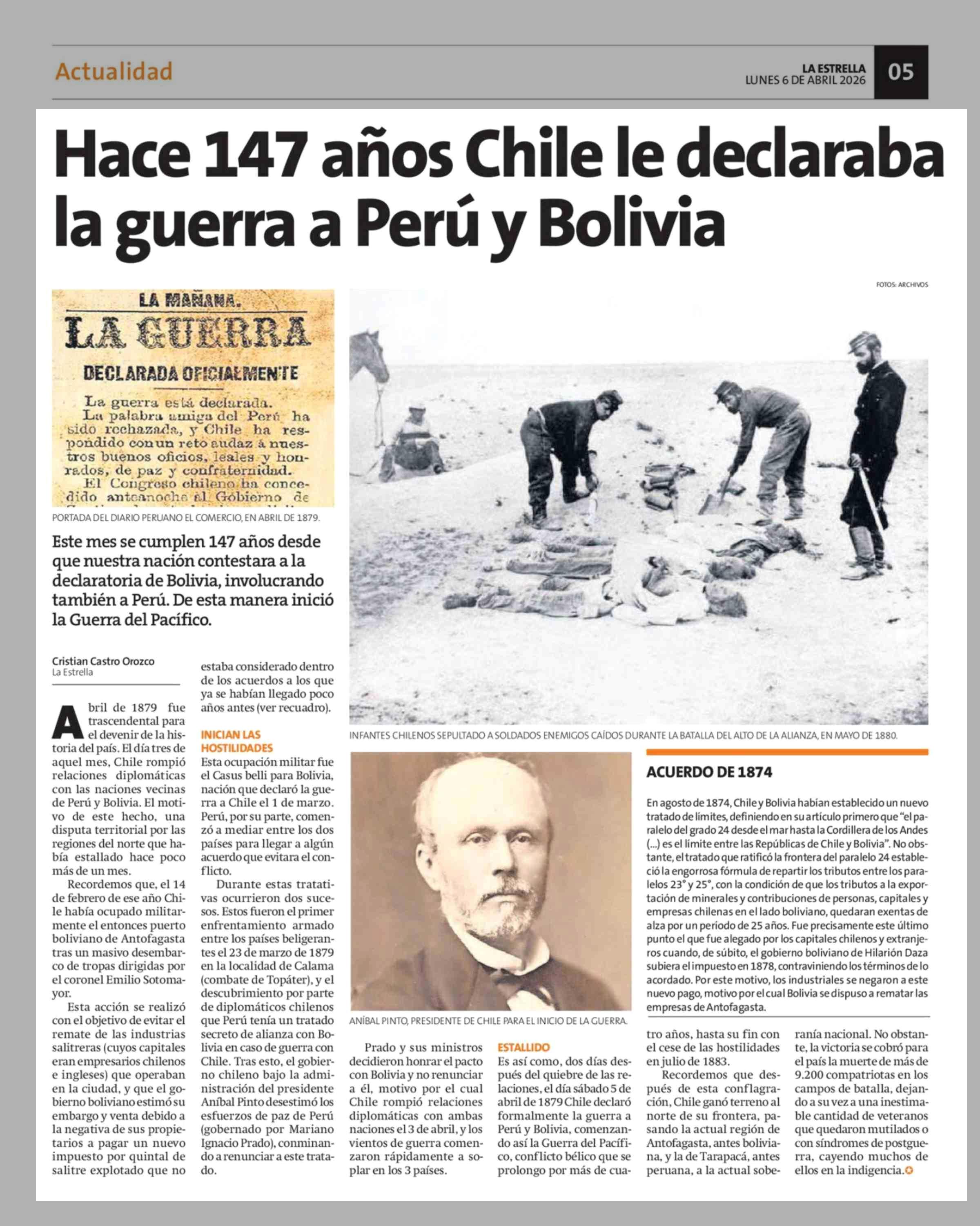Hace 147 años Chile le declaraba la guerra a Perú y Bolivia 06-04-2026 La Estrella de Antofagasta |