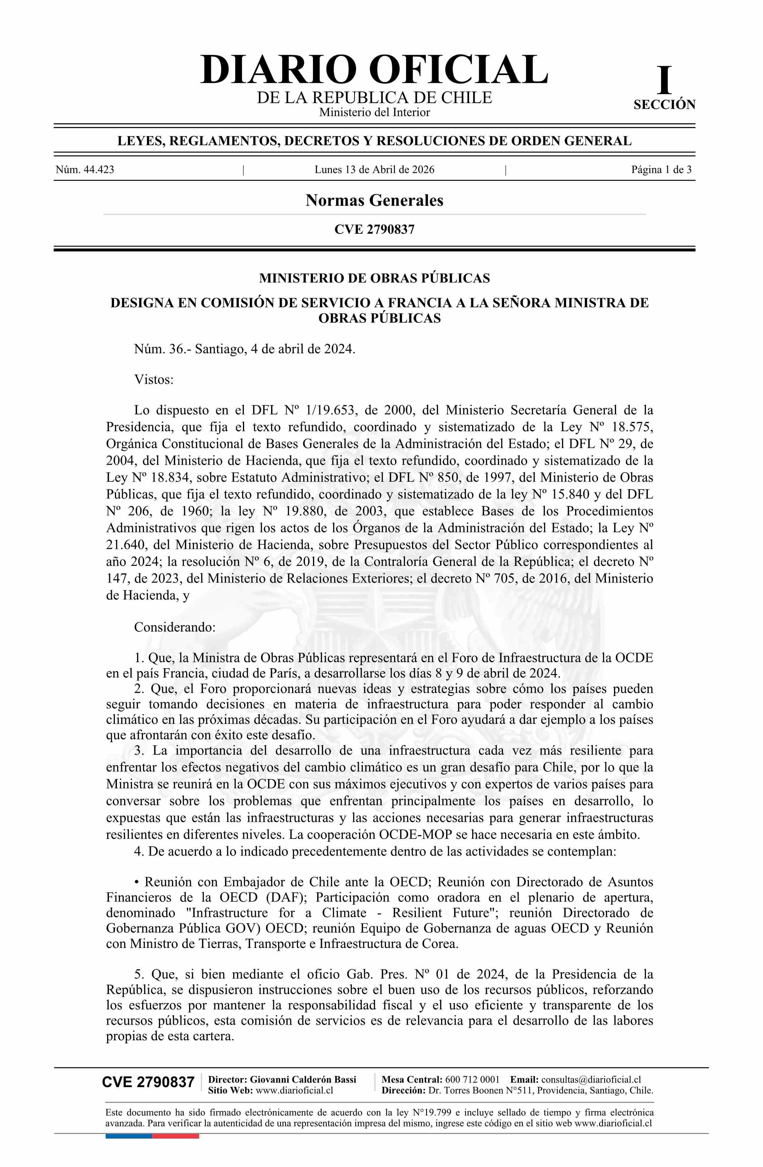 Decreto número 36, de 2024.- Designa en comisión de servicio al extranjero a doña Jessica López Saffie, Ministra de Obras Públicas, a la ciudad de París, Francia 13-04-2026 Diario Oficial Edición Electrónica |
