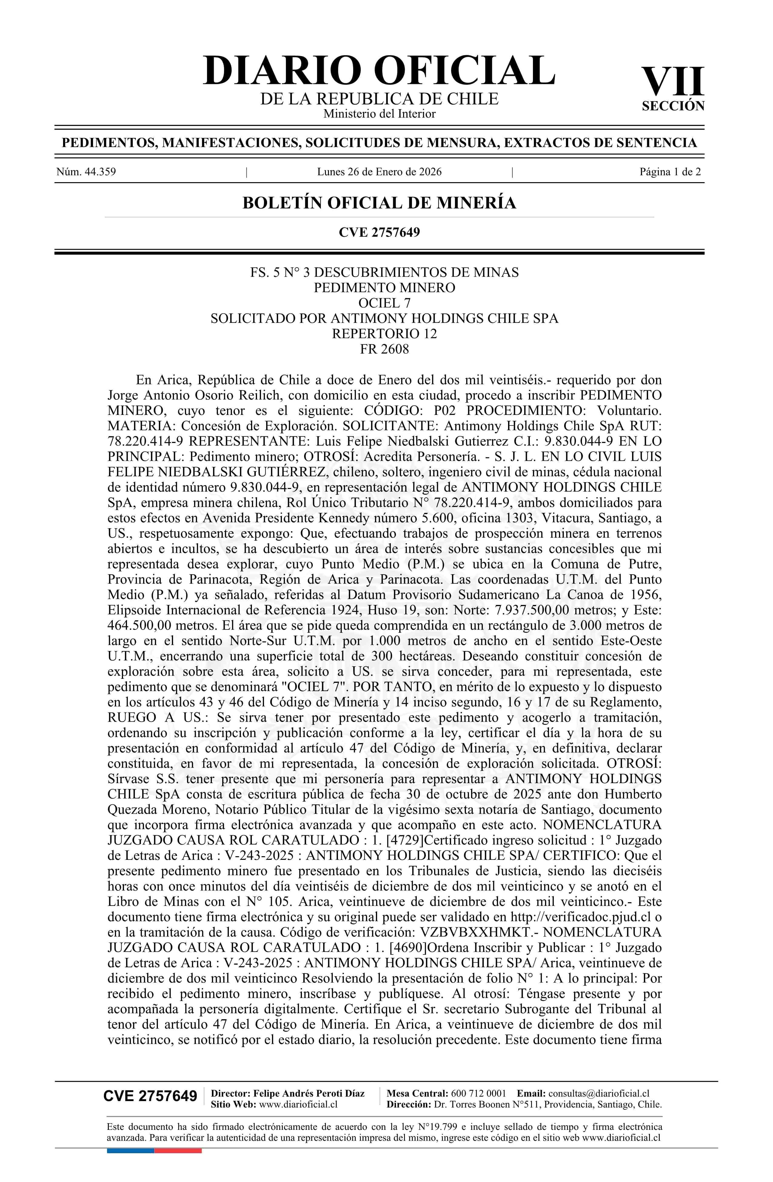 Título: OCIEL 7 / Antimony Holdings Chile SpA