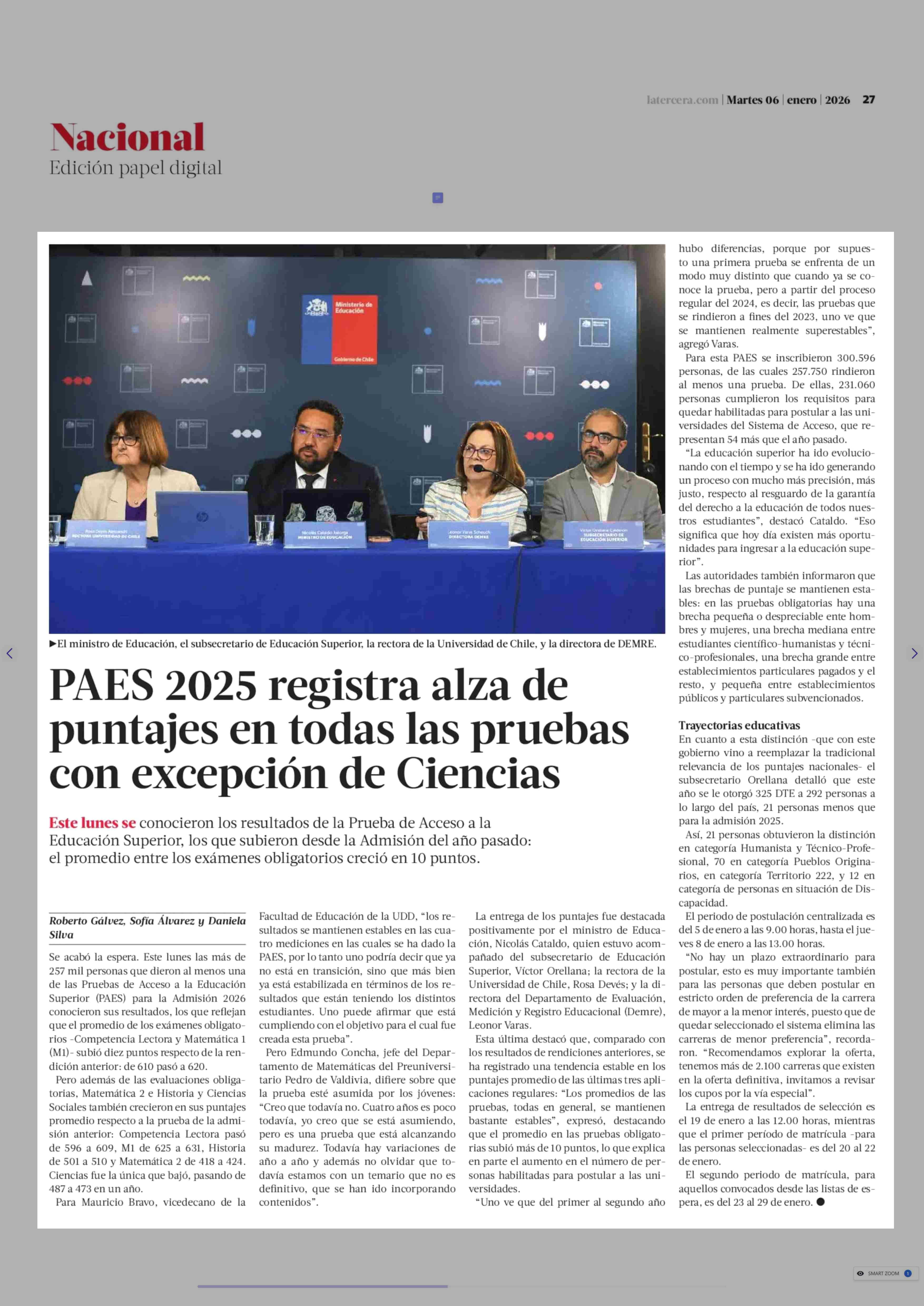 PAES 2025 registra alza de puntajes en todas las pruebas con excepción de Ciencias 06-01-2026 La Tercera |