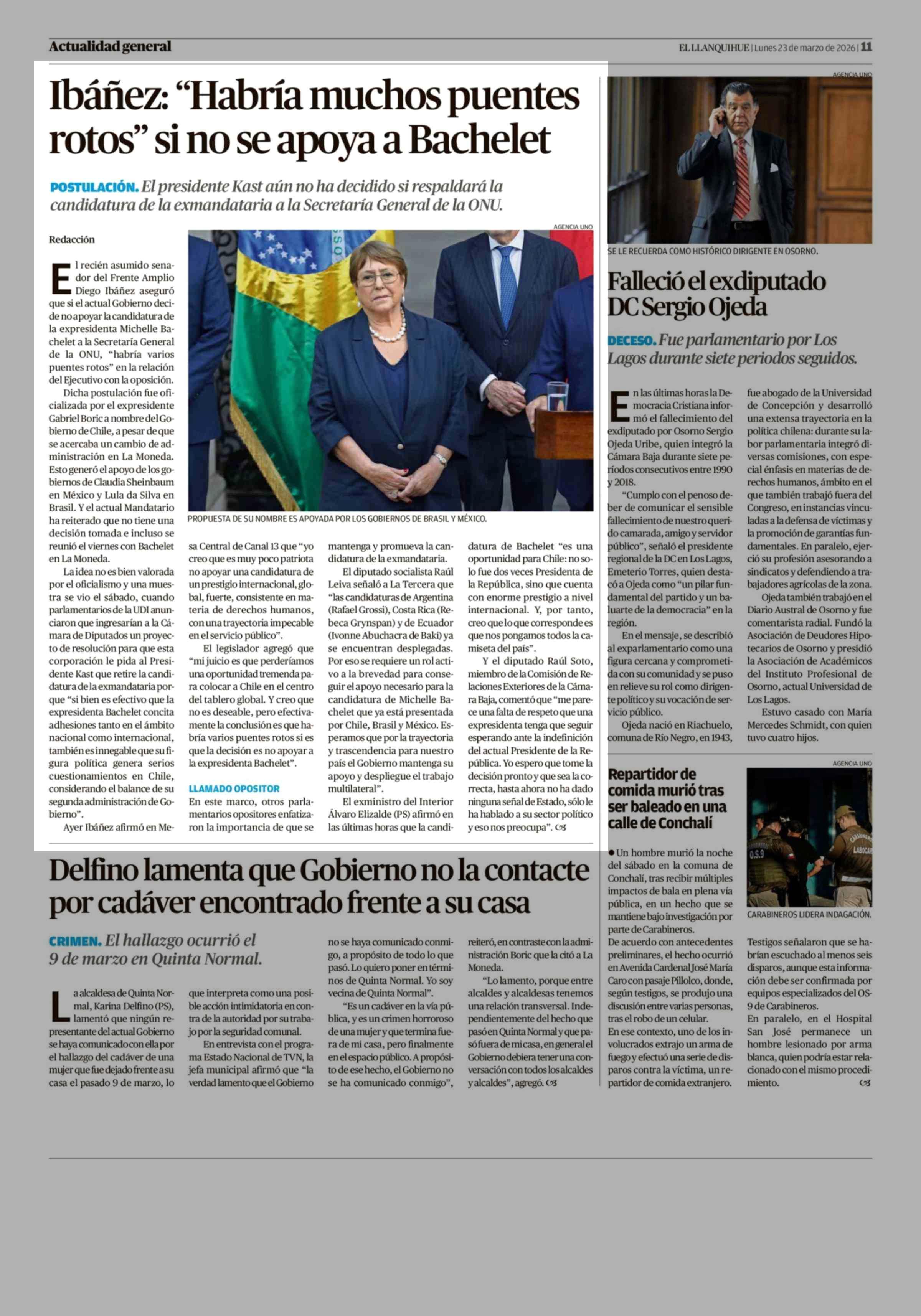 Ibáñez: "Habría muchos puentes rotos" si no se apoya a Bachelet 23-03-2026 El Llanquihue |