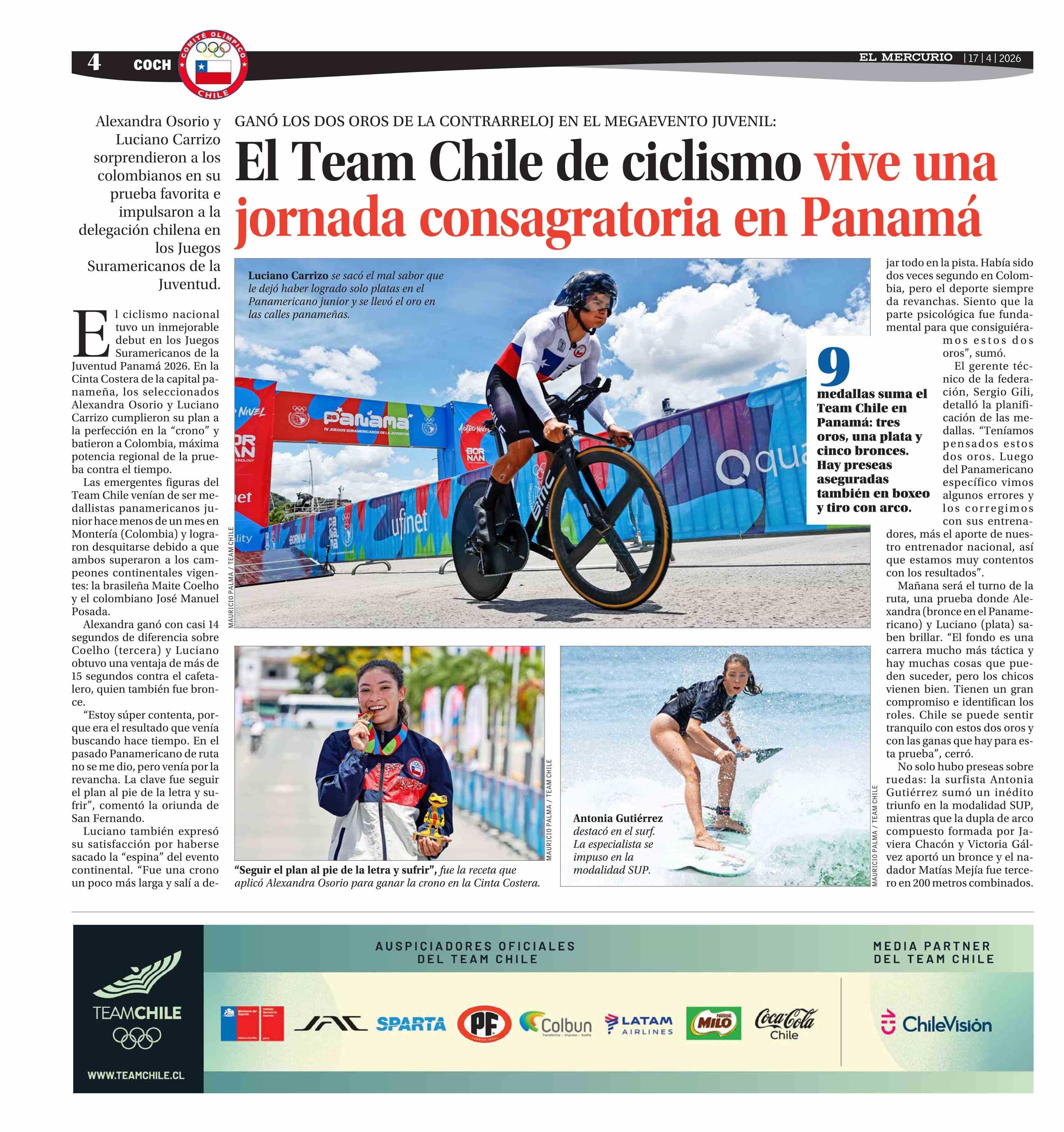 El Team Chile de ciclismo vive una jornada consagratoria en Panamá 17-04-2026 El Mercurio |