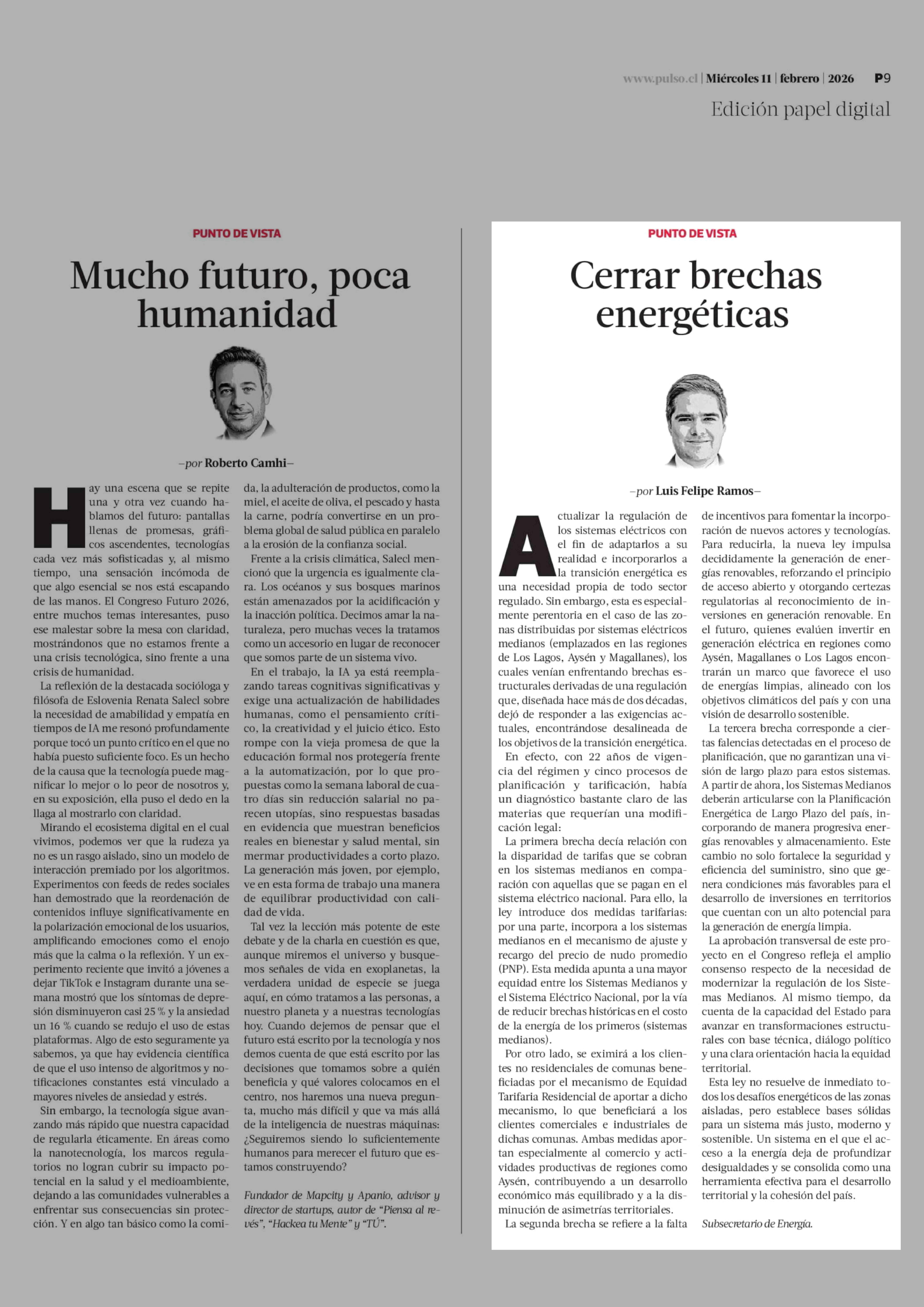 Columnas de Opinión: Cerrar brechas energéticas 11-02-2026 La Tercera |