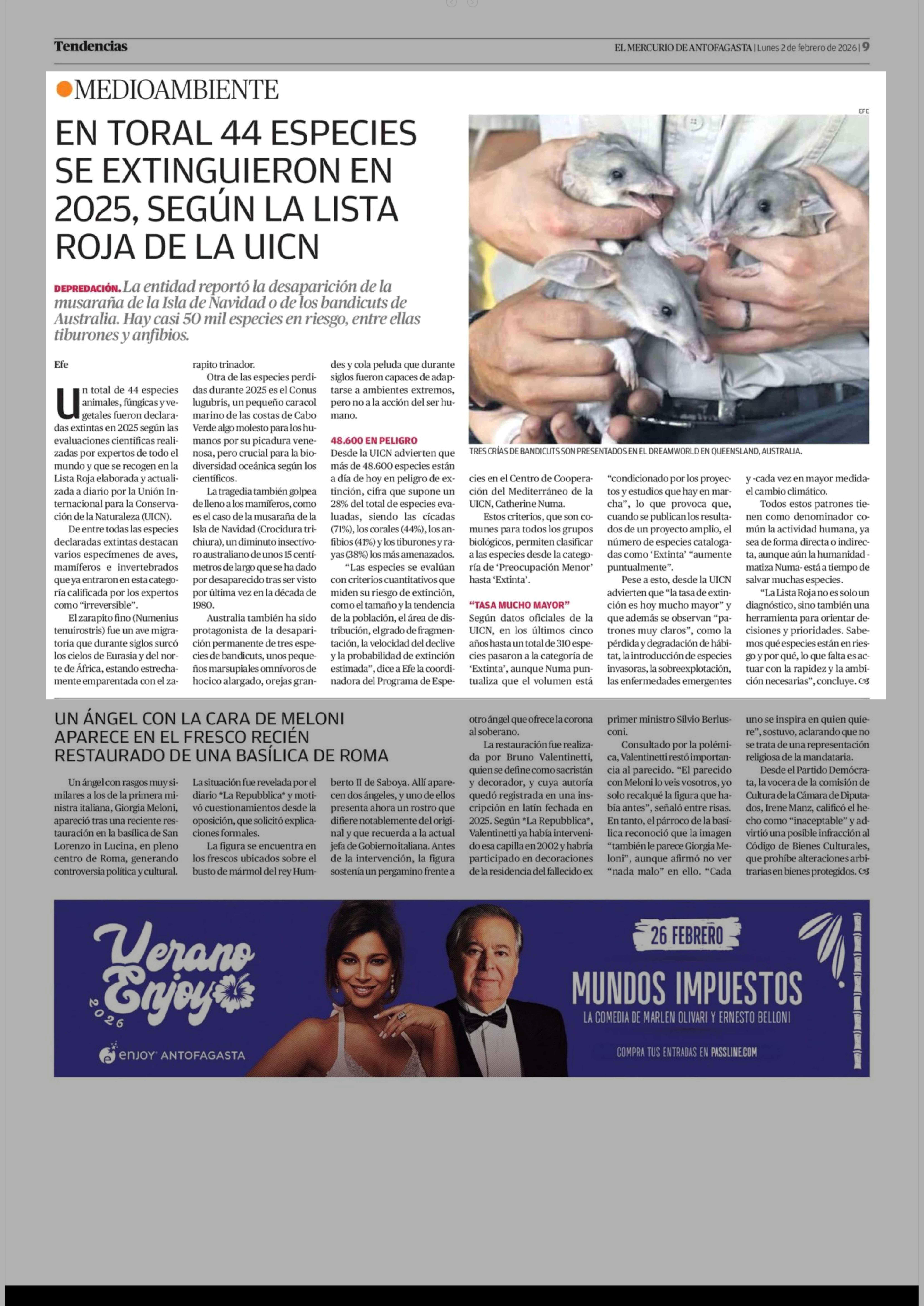 EN TORAL 44 ESPECIES SE EXTINGUIERON EN 2025, SEGÚN LA LISTA ROJA DE LA UICN 02-02-2026 El Mercurio de Antofagasta |