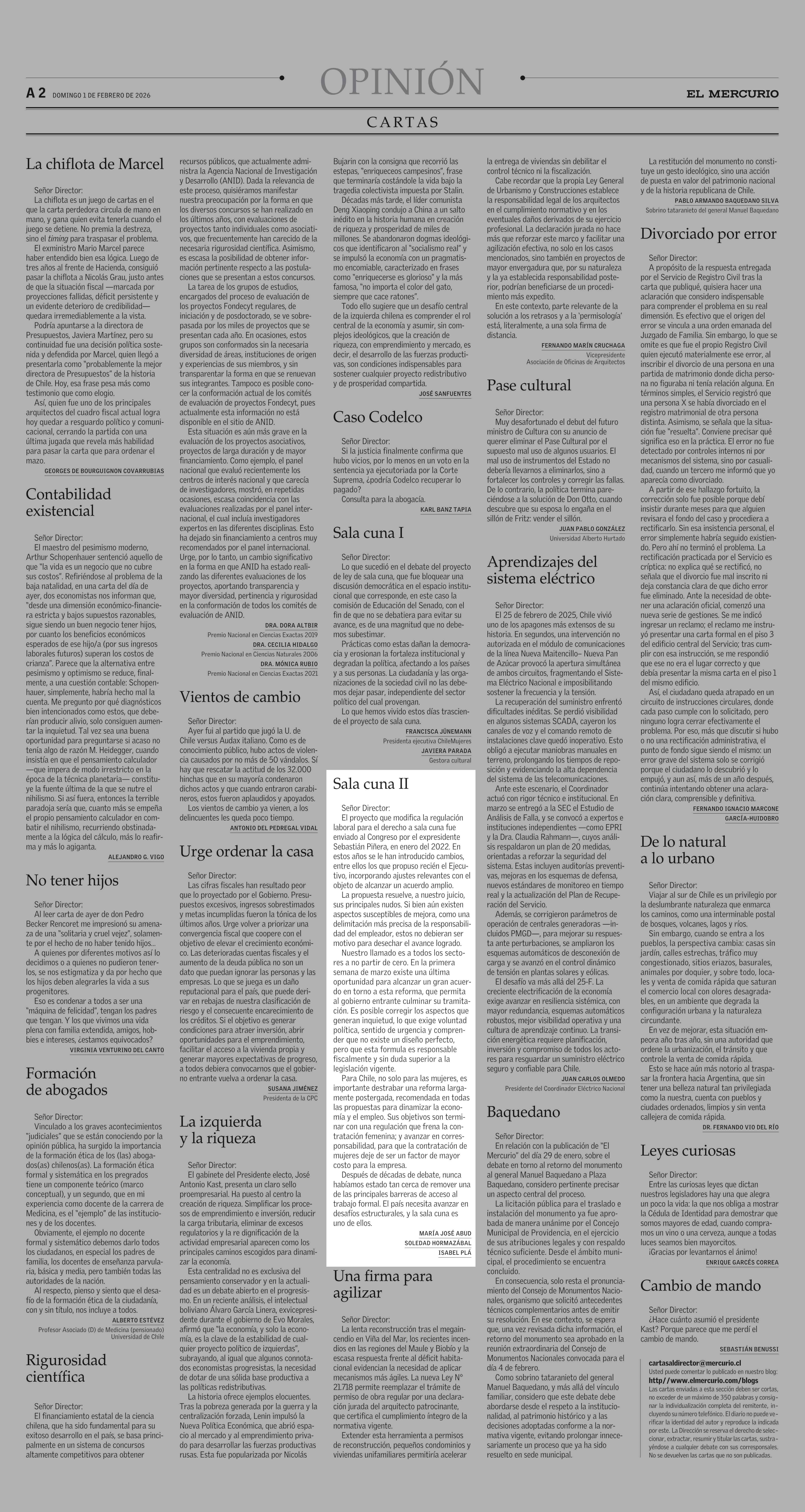 Cartas: Sala cuna II 01-02-2026 El Mercurio |