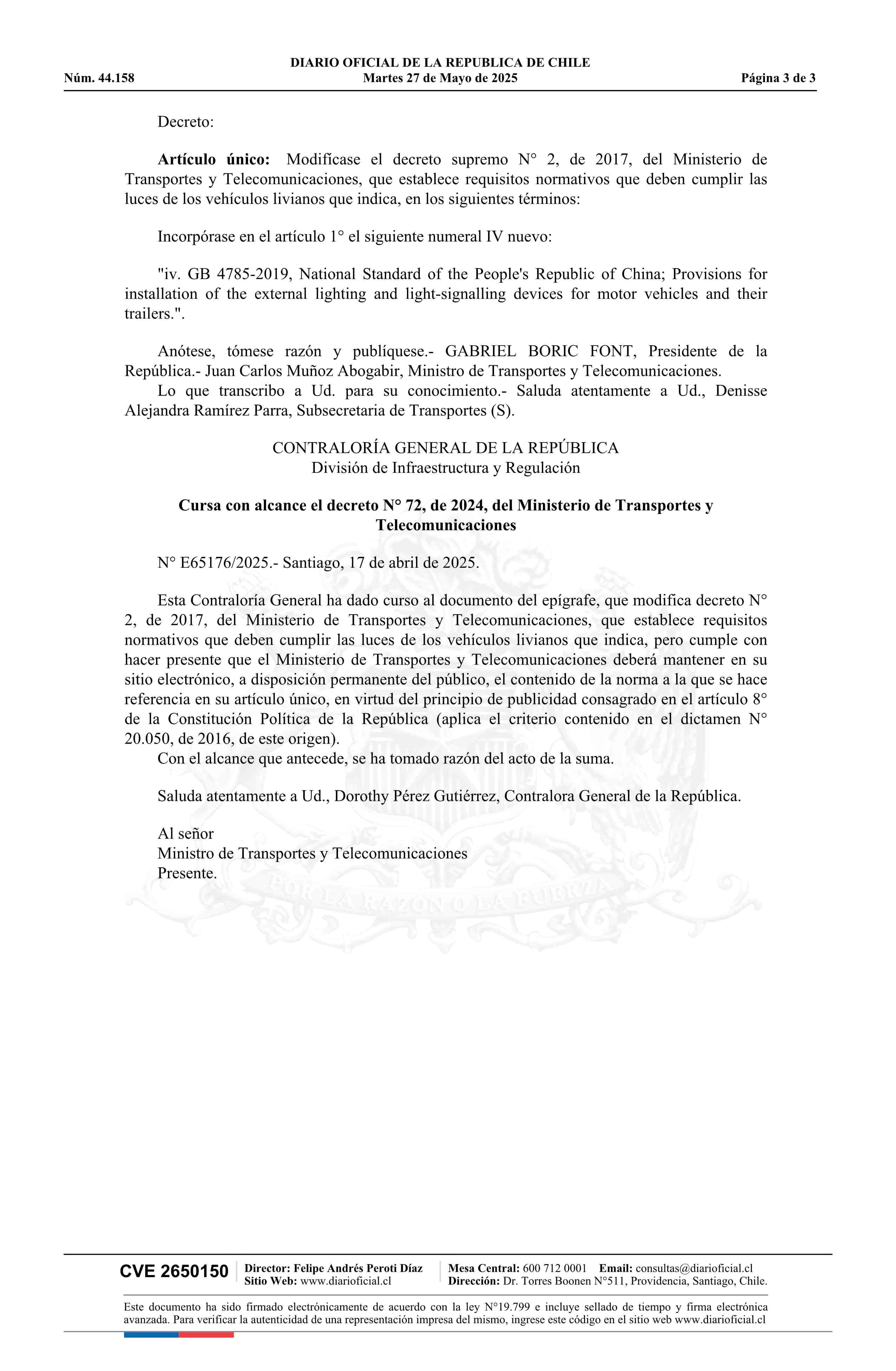 Decreto número 72, de 2024.- Modifica decreto N° 2, de 2017, que establece requisitos normativos que deben cumplir las luces de los vehículos livianos que indica 27-05-2025 Diario Oficial Edición Electrónica |
