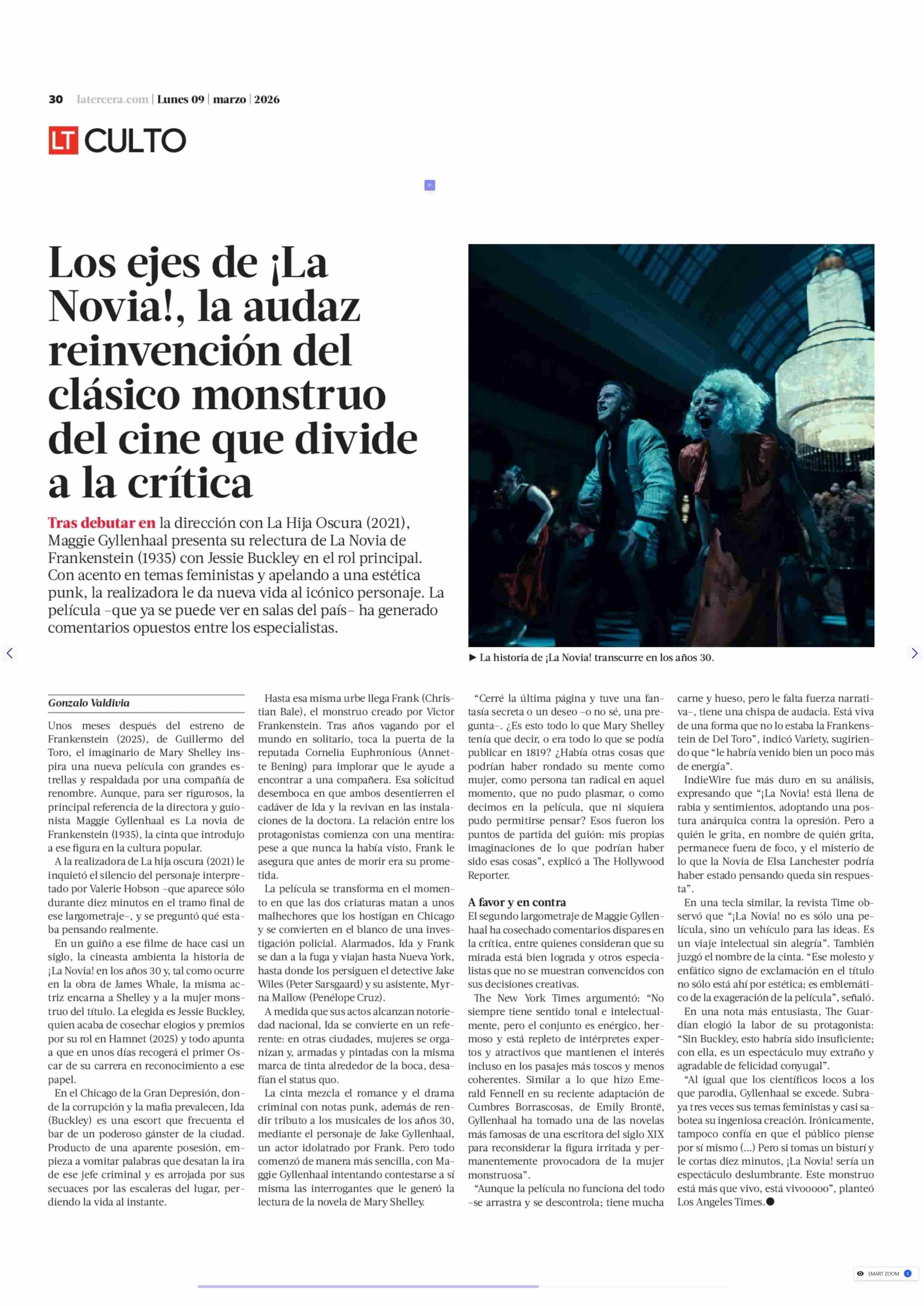 Los ejes de ¡La Novia!, la audaz reinvención del clásico monstruo del cine que divide a la crítica 09-03-2026 La Tercera |